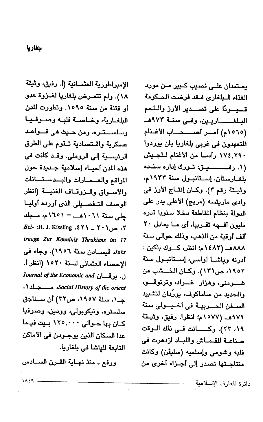 يعتمدان على نصيب كبير من مورد الغذاء البلغارى فقد فرضت الحكومة قيودًا على تصدير الأرز واللحم البلغاريين. وفي سنة 973 هـ (1565 م) أمر أصحاب الأغنام المتعهدون في غربي بلغاريا بأن يوردوا 290, 174 رأسا من الأغنام للجيش (1. رفيق: تورك اداره سنده بلغارستان، استانبول سنة 1933 م، وثيقة رقم 3). وكان إنتاج الأرز في وادي مارشسه (مريج) الأعلى يدر على الدولة بنظام المقاطعة دخلا سنويا قدره مليون آقجه تقريبا، أي ما يعادل 20 ألف أوقية من الذهب، وذلك حوالي سنة 888 هـ (1483 م؛ انظر، كوك بلكين: أدرنه وباشا لواسى، استانبول سنة 1952, ص 131) وكان الخشب من شومنى، وهزار غراد، وترنوفو، والحديد من ساماكوف، يورّدان لتشييد السفن الحربية في آخيولى سنة 979 هـ (1577 م؛ انظرا. رفيق، وثيقة 19, 23). وكانت في ذلك الوقت صناعة للقماش واللباد ازدهرت في فلبه وشومى وإسلميه (سليفن) وكانت منتاجتها تصدر إلى أجزاء أخرى من الإمبراطورية العثمانية (أ. رفيق، وثيقة 18). ولم تتعرض بلغاريا لغزوة عدو أو فتنة من سنة 1595. وتطورت المدن البلغارية، وخاصة فلبه وصوفيا وسلستره، ومن حيث هي قواعد عسكرية واقتصادية تقوم على الطرق الرئيسية إلى الروملى. وقد كانت في هذه المدن أحياء إسلامية جديدة حول المواقع والعمارات والبدستانات والأسواق والزوقاف الغنية (انظر الوصف التفصيلى الذي أورده أوليا جلى سنة 1061 هـ = 1651 م، مجلد 2، ص 301 - 421, bei-: h.j.kenninis thrakiens 17 traege Zur Kenninis Thrakiens im ahr فيسادن سنة 1956). وجاء في الإحصاء العثمانى لسنة 1520) (انظر أ. ل. برقان journalof the Economic and Social History of the orient. مجلد 1، جـ 1 سنه 1957. ص 32) أن سناجق سلستره، ونيكوبولى، وودين، وصوفيا كان بها حوالي 125.000 بيت فيما عدا السكان الذين يوجودن في الأماكن التابعة للباشا في بلغاريا.