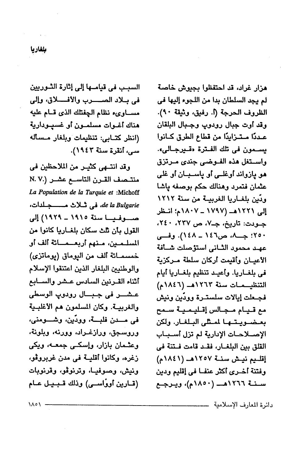هزار غراد، قد احتفظوا بجيوش خاصة لم يجد السلطان بدا من اللجوء إليها في الظروف الحرجة (ا. رفيق، وثيقة 90). وقد أوت جبال رودوب وجبال البلقان عددًا متزايدًا من قطاع الطرق كانوا يسمون في هلك الفترة "قيرجالى". واستغل هذه الفوضى جندى مرتزق هو بازواند أوغلى أو باسبان أو غلى عثمان فتمرد وهنالك حكم بوصفه ياشا وذين بلغاريا الغربية من سنة 1212 إلى 1221 هـ (1797 - 1807 م؛ انظر جودت: تاريخ، جـ 7، ص 237, 240, 250؛ جـ 8 ص 146 - 148). وفي عهد محمود الثاني استؤصلت شافة الأعيان وأقيمت أركان سلطة مركزية في بلغاريا. وأعيد تنظيم بلغاريا أيام التنظيمات سنة 1263 هـ (1846 م) فجعلت إيالات سلسترة وودّين ونيش مع قيام مجالس إقليمية سمح بعضويتها لممثلى البلغار. ولكن الإصلاحات الإدارية لم تزل أسباب القلق بين البلغار، فقد قامت فتنة في إقليم نيش سنة 1257 هـ (1841 م) وفتنة أخرى أكثر عنفا في إقليم ودين سنة 1266 هـ (1850 م)، ويرجع السبب في قيامها إلى إثارة الثوريين في بلاد الصرب والأفلاق، وإلى مساوئ نظام الجفتلك الذي قام عليه هناك أغوات مسلمون أو غسبودارية + (انظر كتابى: تنظيمات وبلغار مسأله سى، أنقرة سنة 1943).
