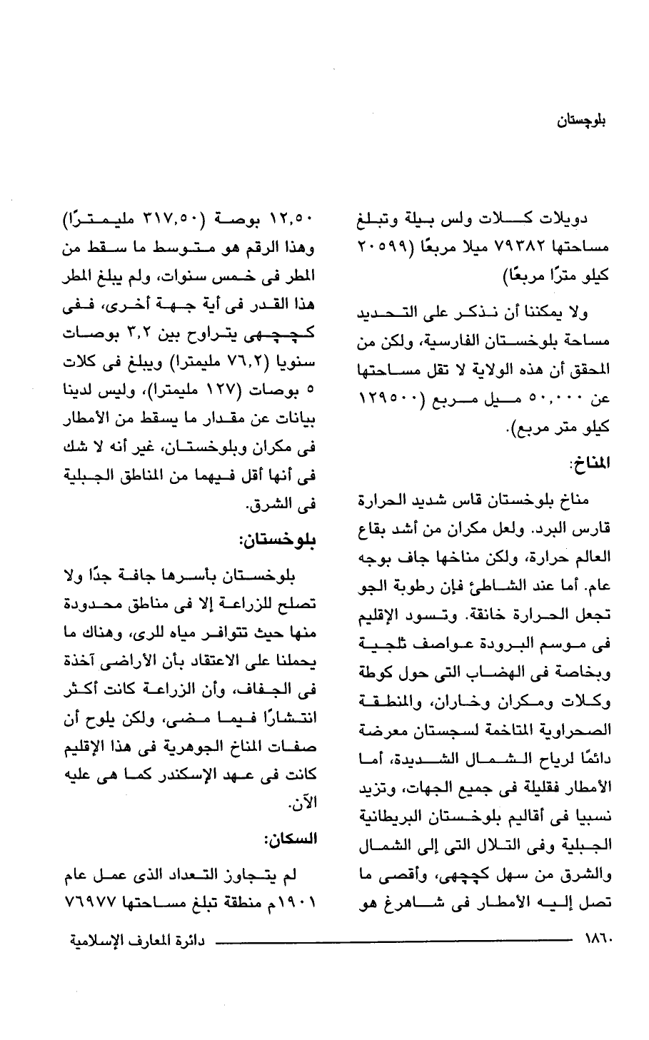 بلوخستان بأسرها جافة جدًّا ولا تصلح للزراعة إلا في مناطق محدودة منها حيث تتوافر مياه للرى، وهناك ما يحملنا على الاعتقاد بأن الأراضي آخذة في الجفاف، وأن الزراعة كانت أكثر انتشارًا فيما مضى، ولكن يلوح أن صفات المناخ الجوهرية في هذا الإقليم كانت في عهد الإسكندر كما هي عليه الآن.