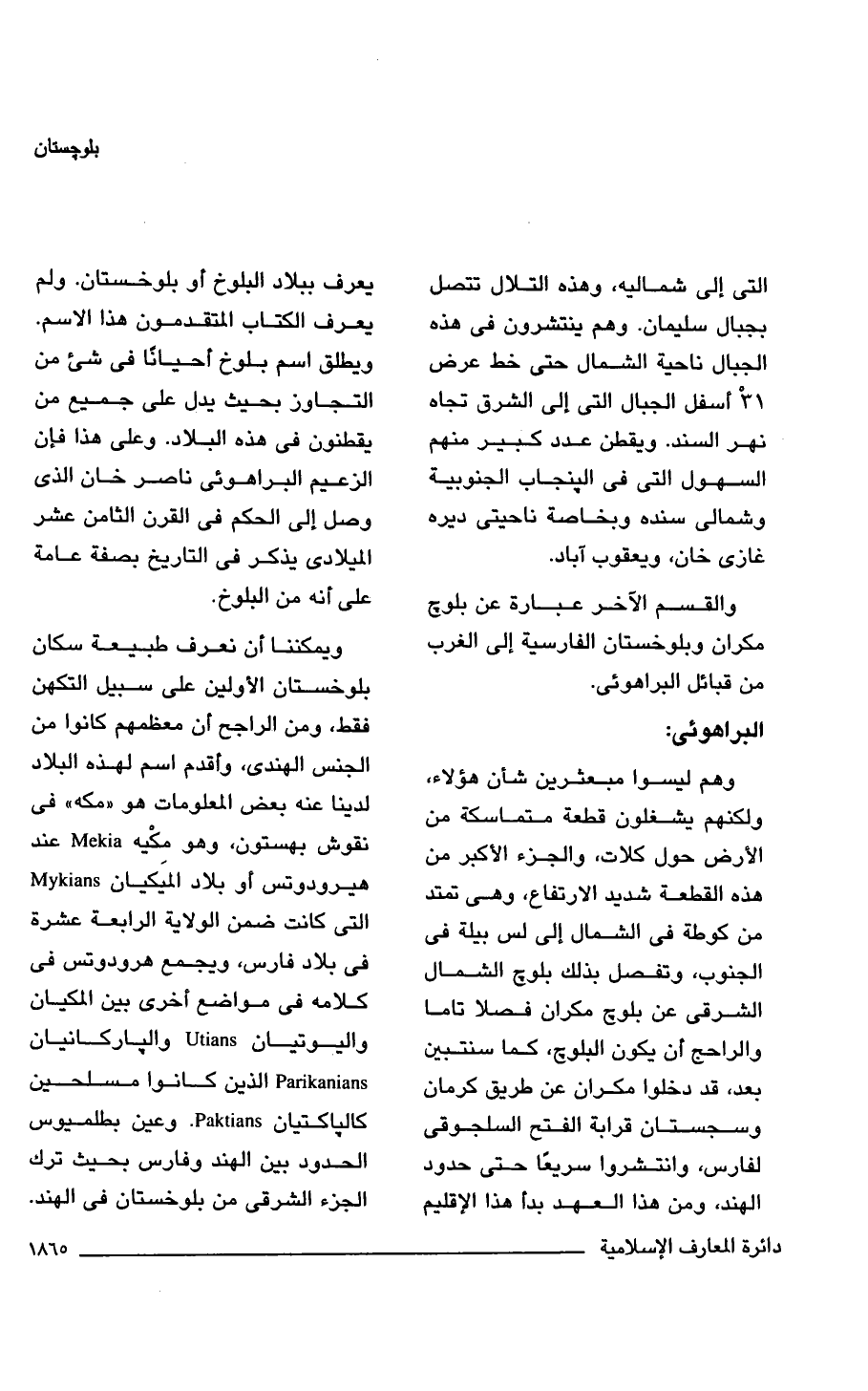 ويمكننا أن نعرف طبيعة سكان بلوخستان الأولين على سبيل التكهن فقط، ومن الراجح أن معظمهم كانوا من الجنس الهندى، وأقدم اسم لهذه البلاد لدينا عنه بعض المعلومات هو "مكه" في نقوش بهستون، وهو مكْيه Mekia عند هيرودوتس أو بلاد الميَكيان Mykians التي كانت ضمن الولاية الرابعة عشرة في بلاد فارس، ويجمع هرودوتس في كلامه في مواضع أخرى بين المكيان واليوتيان Utians والباركانيان Parikanianc الذين كانوا مسلحين كالباكتيان Paktianc . وعين بطلميوس الحدود بين الهند وفارس بحيث ترك الجزء الشرقي من بلوخستان في الهند.