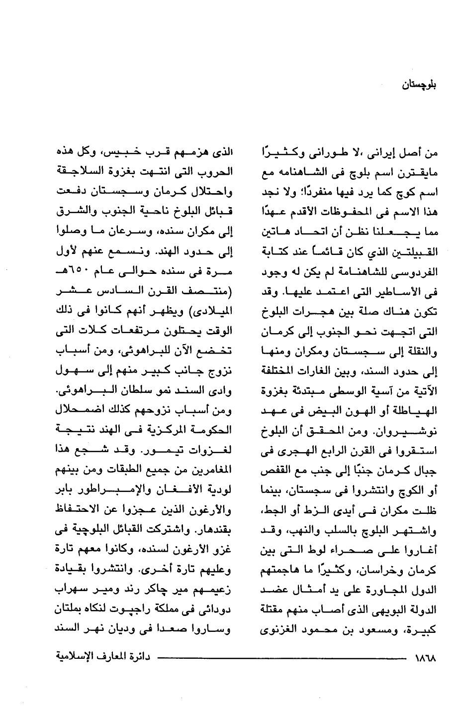 من أصل إيرانى، لا طورانى وكثيرًا ما يقترن اسم بلوج في الشاهنامه مع اسم كوج كما يرد فيها منفردًا؛ ولا نجد هذا الاسم في المحفوظات الأقدم عهدًا مما يجعلنا نظن أن اتحاد هاتين القبيلتين الذي كان قائمًا عند كتابة الفردوسى للشاهنامة لم يكن له وجود في الأساطير التي اعتمد عليها. وقد تكون هناك صلة بين هجرات البلوخ التي اتجهت نحو الجنوب إلى كرمان والنقلة إلى سجستان ومكران ومنها إلى حدود السند، وبين الغارات المختلفة الآتية من آسية الوسطى مبتدئة بغزوة الهياطلة أو الهون البيض في عهد نوشيروان. ومن المحقق أن البلوخ استقروا في القرن الرابع الهجرى في جبال كرمان جنبًا إلى جنب مع القفص أو الكوج وانتشروا في سجستان، بينما ظلت مكران في أيدى الزط أو الجط، واشتهر البلوج بالسلب والنهب، وقد أغاروا على صحراء لوط التي بين كرمان وخراسان، وكثيرًا ما هاجمتهم الدول المجاورة على يد أمثال عضد الدولة البويهى الذي أصاب منهم مقتلة كبيرة، ومسعود بن محمود الغزنوى الذي هزمهم قرب خبيس، وكل هذه الحروب التي انتهت بغزوة السلاجقة واحتلال كرمان وسجستان دفعت قبائل البلوخ ناحية الجنوب والشرق إلى مكران سنده، وسرعان ما وصلوا إلى حدود الهند. ونسمع عنهم لأول مرة في سنده حوالي عام 650 هـ (منتصف القرن السادس عشر الميلادي) ويظهر أنهم كانوا في ذلك الوقت يحتلون مرتفعات كلات التي تخضع الآن للبراهوئى، ومن أسباب نزوج جانب كبير منهم إلى سهول وادي السند نمو سلطان البراهوئى. ومن أسباب نزوحهم كذلك اضمحلال الحكومة المركزية في الهند نتيجة لغزوات تيمور. وقد شجع هذا المغامرين من جميع الطبقات ومن بينهم لودية الأفغان والإمبراطور بابر والأرغون الذين عجزوا عن الاحتفاظ بقندهار. واشتركت القبائل البلوجية في غزو الأرغون لسنده، وكانوا معهم تارة وعليهم تارة أخرى. وانتشروا بقيادة زعيمهم مير جاكر رند ومير سهراب دودائى في مملكة راجبوت لنكاه بملتان وساروا صعدا في وديان نهر السند
