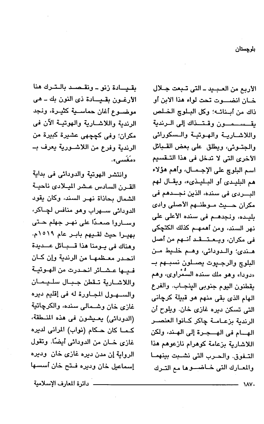 الأربع من العبيد - التي تبعت جلال خان انضوت تحت لواء هذا الابن أو ذاك من أبنائه؛ وكل البلوج الخلص يقسمون وقتذاك إلى الرندية واللاشارية والهوتية والسكورائى والجتوئى، ويطلق على بعض القبائل الأخرى التي لا تدخل في هذا التقسيم اسم البلوج على الإجمال، وأهم هؤلاء هم البليدى أو البليذئ، ويقال لهم البردى في سنده، الذين نجدهم في مكران حيث موطنهم الأصلي وادي بليده، ونجدهم في سنده الأعلى على نهر السند، ومن أهمهم كذلك الكتجكى في مكران، ويعتقد أنهم من أصل هندى؛ والدودائى، وهم خليط من البلوج والرجيوت يصلون نسبهم بـ "دودا" وهو ملك سنده السُّمْراوى، وهم يقطنون اليوم جنوبي الينجاب. والفرع الهام الذي بقى منهم هو قبيلة كرجانى التي تسكن ديره غازى خان. ويلوح أن الرندية بزعامة جاكر كانوا العنصر الهام في الهجرة إلى الهند، ولكن اللاشارية بزعامة كوهرام نازعوهم هذا التفوق. والحرب التي نشبت بينهما والمعارك التي خاضوها مع الترك بقيادة زنو - ونقصد بالترك هنا الأرغون بقيادة ذي النون بك - هي موضوع أغان حماسية كثيرة، ونجد الرندية واللاشارية والهوتية الآن في مكران؛ وفي كججهى عشيرة كبيرة من الرندية وفرع من اللاشورية يعرف بـ "مَغَسى".