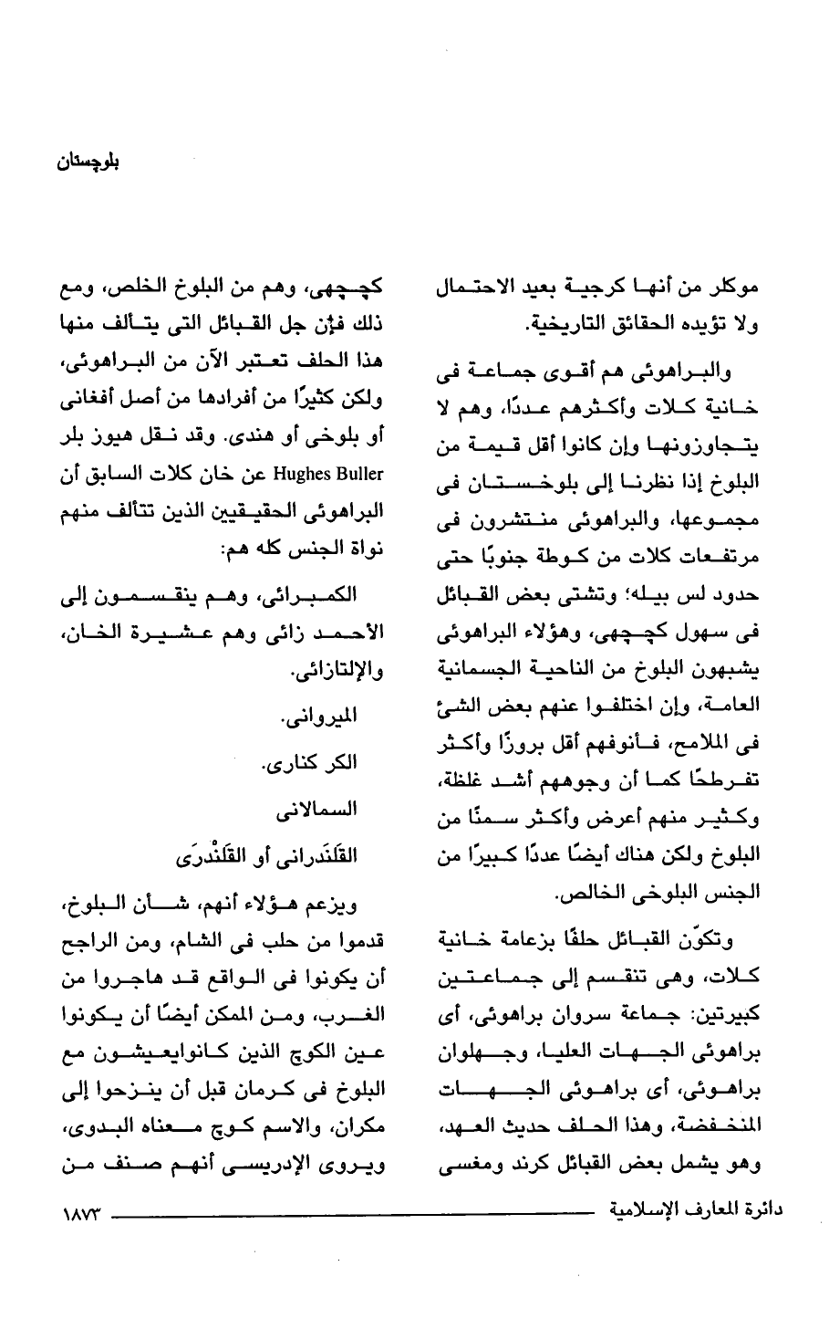 والبراهوئى هم أقوى جماعة في خانية كلات وأكثرهم عددًا، وهم لا يتجاوزونها وإن كانوا أقل قيمة من البلوخ إذا نظرنا إلى بلوخستان في مجموعها، والبراهوئى منتشرون في مرتفعات كلات من كوطة جنوبًا حتى حدود لس بيله؛ وتشتى بعض القبائل في سهول كججهى، وهؤلاء البراهوئى يشبهون البلوخ من الناحية الجسمانية العامة، وإن اختلفوا عنهم بعض الشيء في الملامح، فأنوفهم أقل بروزا وأكثر تفرطحًا كما أن وجوههم أشد غلظة، وكثير منهم أعرض وأكثر سمنًا من البلوخ ولكن هناك أيضًا عددا كبيرًا من الجنس البلوخى الخالص.
