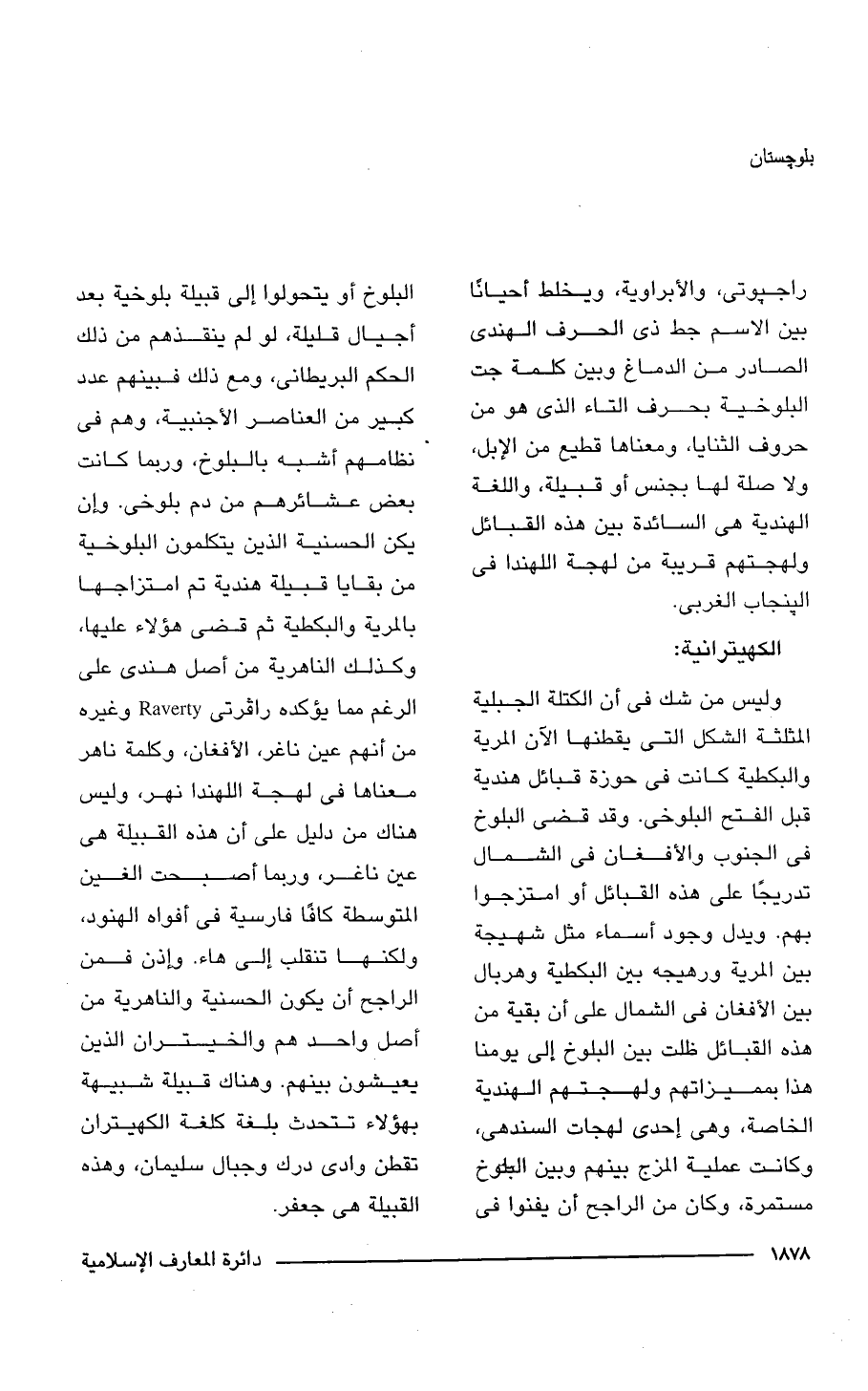 وليس من شك في أن الكتلة الجبلية المثلثة الشكل التي يقطنها الآن المرية والبكطية كانت في حوزة قبائل هندية قبل الفتح البلوخى. وقد قضى البلوخ في الجنوب والأفغان في الشمال تدريجًا على هذه القبائل أو امتزجوا بهم. ويدل وجود أسماء مثل شهيجة بين المرية ورهيجه بين البكطية وهربال بين الأفغان في الشمال على أن بقية من هذه القبائل ظلت بين البلوخ إلى يومنا هذا بمميزاتهم ولهجتهم الهندية الخاصة، وهي إحدى لهجات السندهى، وكانت عملية المزج بينهم وبين البلوخ مستمرة، وكان من الراجح أن يفنوا في البلوخ أو يتحولوا إلى قبيلة بلوخية بعد أجيال قليلة، لو لم ينقذهم من ذلك الحكم البريطانى، ومع ذلك فبينهم عدد كبير من العناصر الأجنبية، وهم في نظامهم أشبه بالبلوخ، وربما كانت بعض عشائرهم من دم بلوخى. وإن يكن الحسنية الذين يتكلمون البلوخية من بقايا قبيلة هندية تم امتزاجها بالمرية والبكطية ثم قضى هؤلاء عليها، وكذلك الناهرية من أصل هندى على الرغم مما يؤكده رافرتى Raverty وغيره من أنهم عين ناغر، الأفغان، وكلمة ناهر معناها في لهجة اللهندا نهر، وليس هناك من دليل على أن هذه القبيلة هي عين ناغر، وربما أصبحت الغين المتوسطة كافًا فارسية في أفواه الهنود، ولكنها تنقلب إلى هاء. د إذن فمن الراجح أن يكون الحسنية والناهرية من أصل واحد هم والخيتران الذين يعيشون بينهم. وهناك قبيلة شبيهة بهؤلاء تتحدث بلغة كلغة الكهيتران تقطن وادي درك وجبال سليمان، وهذه القبيلة هي جعفر.