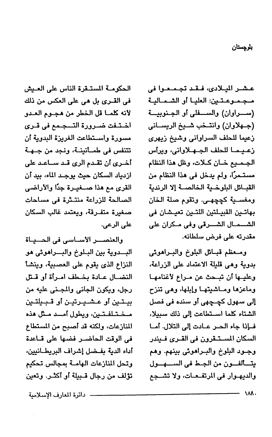 عشر الميلادي، فقد تجمعوا في مجموعتين: العليا أو الشمالية (سراوان) والسفلى أو الجنوبية (جهلاوان) وانتخب شيخ الريسانى زعيما للحلف السراوانى وشيخ زيهرى زعيما للحلف الجهلاوانى، ويرأس الجميع خان كلات، وظل هذا النظام مستمرًا، ولم يدخل في هذا النظام من القبائل البلوخية الخالصة إلا الرندية ومغسية كججهى. وتقوم صلة الخان بهاتين القبيلتين اللتين تعيشان في الشمال الشرقي وفي مكران على مقدرته على فرض سلطانه.