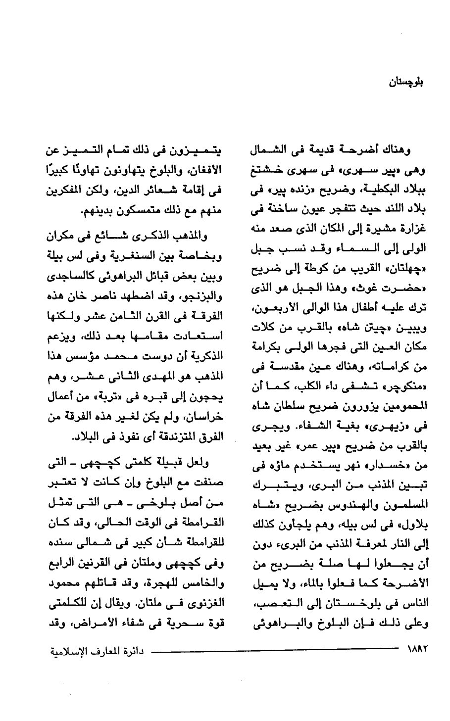 وهناك أضرحة قديمة في الشمال وهي "بير سهرى" في سهرى خشتغ ببلاد البكطية، وضريح "زنده بير" في بلاد اللند حيث تتفجر عيون ساخنة في غزارة مشيرة إلى المكان الذي صعد منه الولى إلى السماء وقد نسب جبل "جهلتان" القريب من كوطة إلى ضريح "حضرت غوث" وهذا الجبل هو الذي ترك عليه أطفال هذا الوالى الأربعون، ويبين "جيتن شاه" بالقرب من كلات مكان العين التي فجرها الولى بكرامة من كراماته، وهناك عين مقدسة في "منكوجر" تشفى داء الكلب، كما أن المحمومين يزورون ضريح سلطان شاه في "زيهرى" بغية الشفاء. ويجرى بالقرب من ضريح "بير عمر" غير بعيد من "خسدار" نهر يستخدم ماؤه في تبين المذنب من البرى، ويتبرك المسلمون والهندوس بضريح "شاه بلاول" في لس بيله، وهم يلجأون كذلك إلى النار لمعرفة المذنب من البرئ دون أن يجعلوا لها صلة بضريح من الأضرحة كما فعلوا بالماء، ولا يميل الناس في بلوخستان إلى التعصب، وعلى ذلك فإن البلوخ والبراهوئى يتميزون في ذلك تمام التميز عن الأفغان، والبلوخ يتهاونون تهاونًا كبيرًا في إقامة شعائر الدين، ولكن المفكرين منهم مع ذلك متمسكون بدينهم.