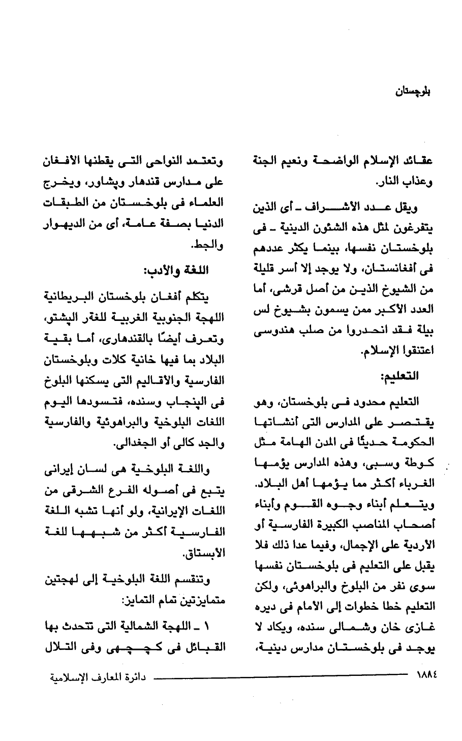 التعليم محدود في بلوخستان، وهو يقتصر على المدارس التي أنشاتها الحكومة حديثًا في المدن الهامة مثل كوطة وسبى، وهذه المدارس يؤمها الغرباء أكثر مما يؤمها أهل البلاد. ويتعلم أبناء وجوه القوم وأبناء أصحاب المناصب الكبيرة الفارسية أو الأردية على الإجمال، وفيما عدا ذلك فلا يقبل على التعليم في بلوخستان نفسها سوى نفر من البلوخ والبراهوئى، ولكن التعليم خطا خطوات إلى الإمام في ديره غازى خان وشمالى سنده، ويكاد لا يوجد في بلوخستان مدارس دينية، وتعتمد النواحى التي يقطنها الأفغان على مدارس قندهار وبشاور، ويخرج العلماء في بلوخستان من الطبقات الدنيا بصفة عامة، أي من الديهوار والجط.