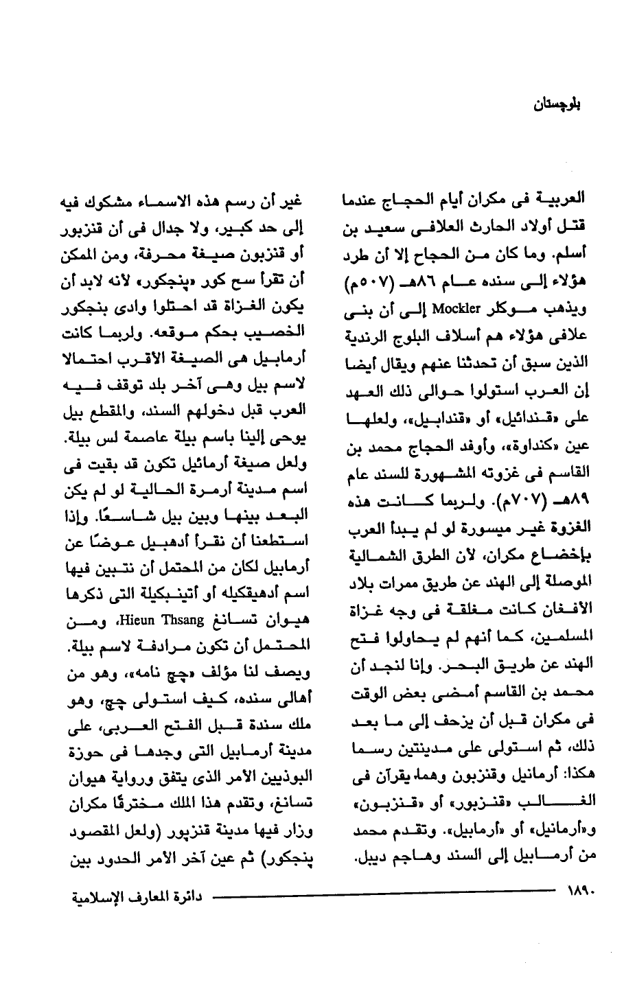 العربية في مكران أيام الحجاج عندما قتل أولاد الحارث العلافى سعيد بن أسلم. وما كان من الحجاح إلا أن طرد هؤلاء إلى سنده عام 86 هـ (507 م) ويذهب موكلر Mockler إلى أن بنى علافى هؤلاء هم أسلاف البلوج الرندية الذين سبق أن تحدثنا عنهم ويقال أيضًا إن العرب استولوا حوالي ذلك العهد على "قندائيل" أو"قندابيل"، ولعلها عين "كنداوة"، وأوفد الحجاج محمد بن القاسم في غزوته المشهورة للسند عام 89 هـ (707 م). ولربما كانت هذه الغزوة غير ميسورة لو لم يبدأ العرب بإخضاع مكران، لأن الطرق الشمالية الموصلة إلى الهند عن طريق ممرات بلاد الأفغان كانت مغلقة في وجه غزاة المسلمين، كما أنهم لم يحاولوا فتح الهند عن طريق البحر. وإنا لنجد أن محمد بن القاسم أمضى بعض الوقت في مكران قبل أن يزحف إلى ما بعد ذلك، ثم استولى على مدينتين رسما هكذا: أرمانيل وقنزبون وهما يقرآن في الغالب "قنزبور" أو "قنزبون" و"أرمانيل" أو"أرمابيل". وتقدم محمد من أرمابيل إلى السند وهاجم ديبل.