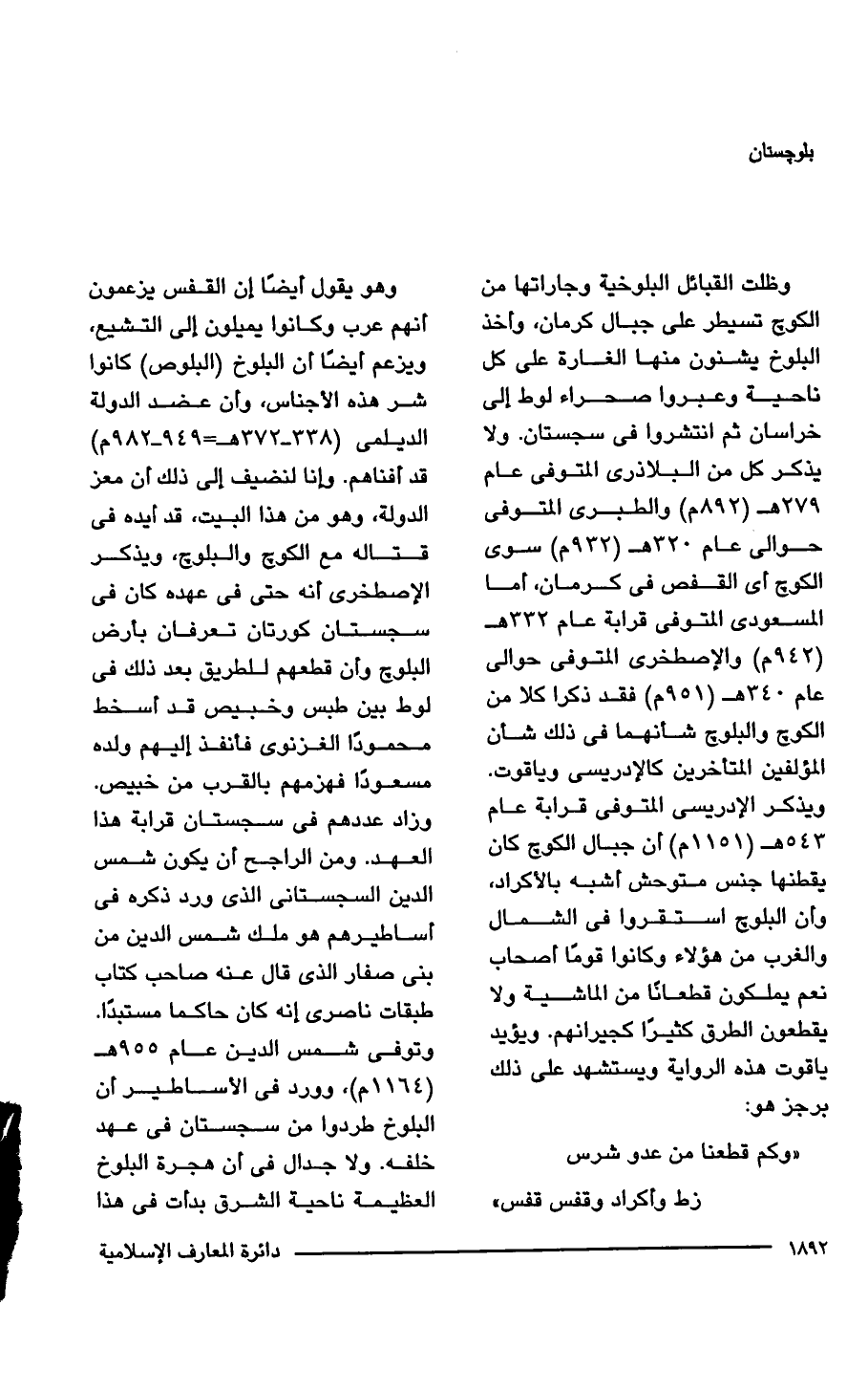 وهو يقول أيضًا إن القفس يزعمون أنهم عرب وكانوا يميلون إلى التشيع، ويزعم أيضًا أن البلوخ (البلوص) كانوا شر هذه الأجناس، وأن عضد الدولة الديلمى (338 - 372 هـ = 949 - 982 م) قد أفناهم. وإنا لنضيف إلى ذلك أن معز الدولة، وهو من هذا البيت، قد أيده في قتاله مع الكوج والبلوج، ويذكر الإصطخري أنه حتى في عهده كان في سجستان كورتان تعرفان بأرض البلوج وأن قطعهم للطريق بعد ذلك في لوط بين طبس وخبيص قد أسخط محمودًا الغزنوى فأنفذ إليهم ولده مسعودًا فهزمهم بالقرب من خبيص. وزاد عددهم في سجستان قرابة هذا العهد. ومن الراجح أن يكون شمس الدين السجستانى الذي ورد ذكره في أساطيرهم هو ملك شمس الدين من بنى صفار الذي قال عنه صاحب كتاب طبقات ناصرى إنه كان حاكما مستبدًا. وتوفى شمس الدين عام 955 هـ (1164 م)، وورد في الأساطير أن البلوخ طردوا من سجستان في عهد خلفه. ولا جدال في أن هجرة البلوخ العظيمة ناحية الشرق بدأت في هذا