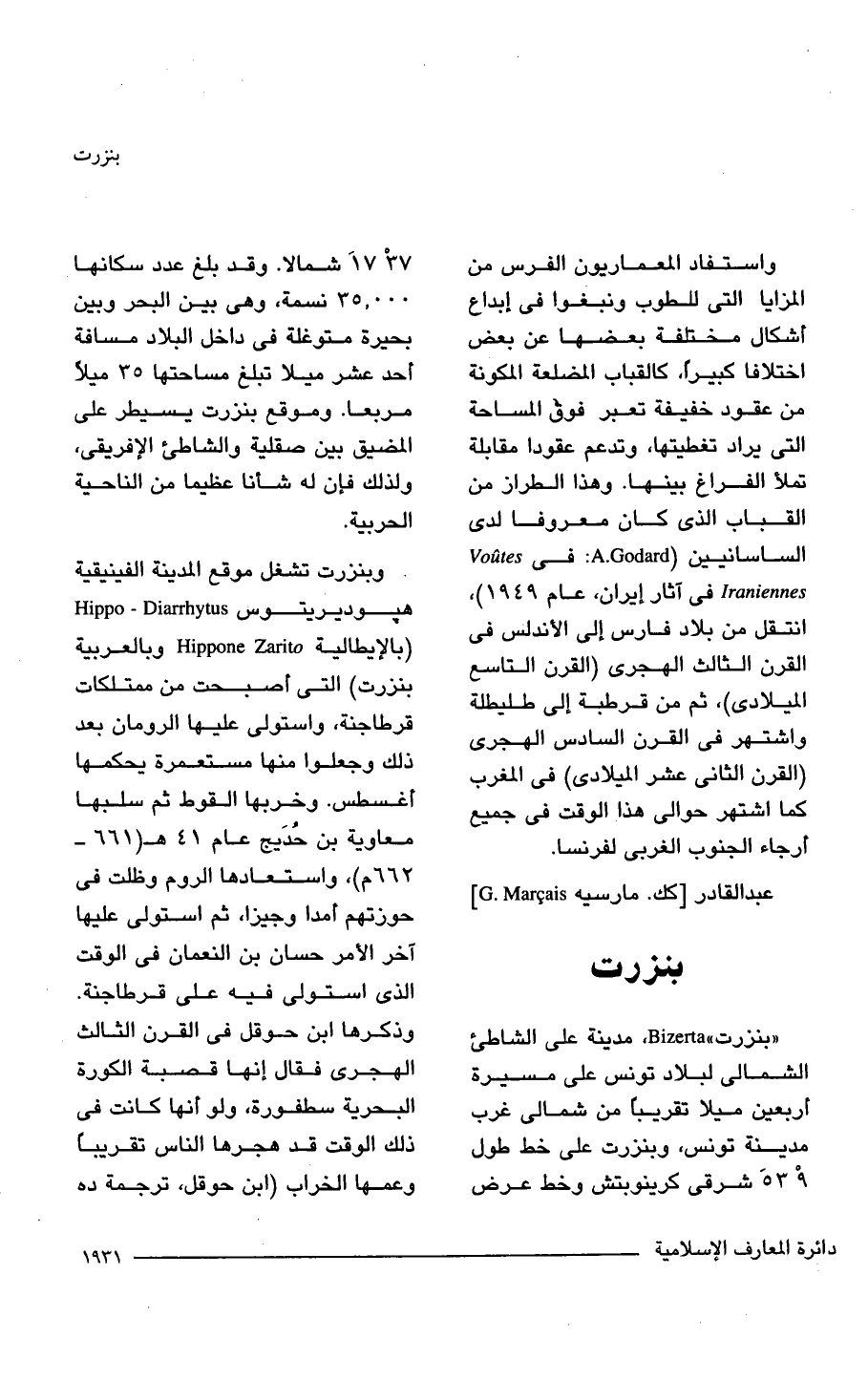 " بنزرت" Bizerta. مدينة على الشاطئ الشمالي لبلاد تونس على مسيرة أربعين ميلا تقريبًا من شمالي غرب مدينة تونس، وبنزرت على خط طول 539 شرقي كرينوبتش وخط عرض 1737 شمالا. وقد بلغ عدد سكانها 35.000 نسمة، وهي بين البحر وبين بحيرة متوغلة في داخل البلاد مسافة أحد عشر ميلا تبلغ مساحتها 35 ميلًا مربعا. وموقع بنزرت يسيطر على المضيق بين صقلية والشاطئ الإفريقى، ولذلك فإن له شأنا عظيما من الناحية الحربية.