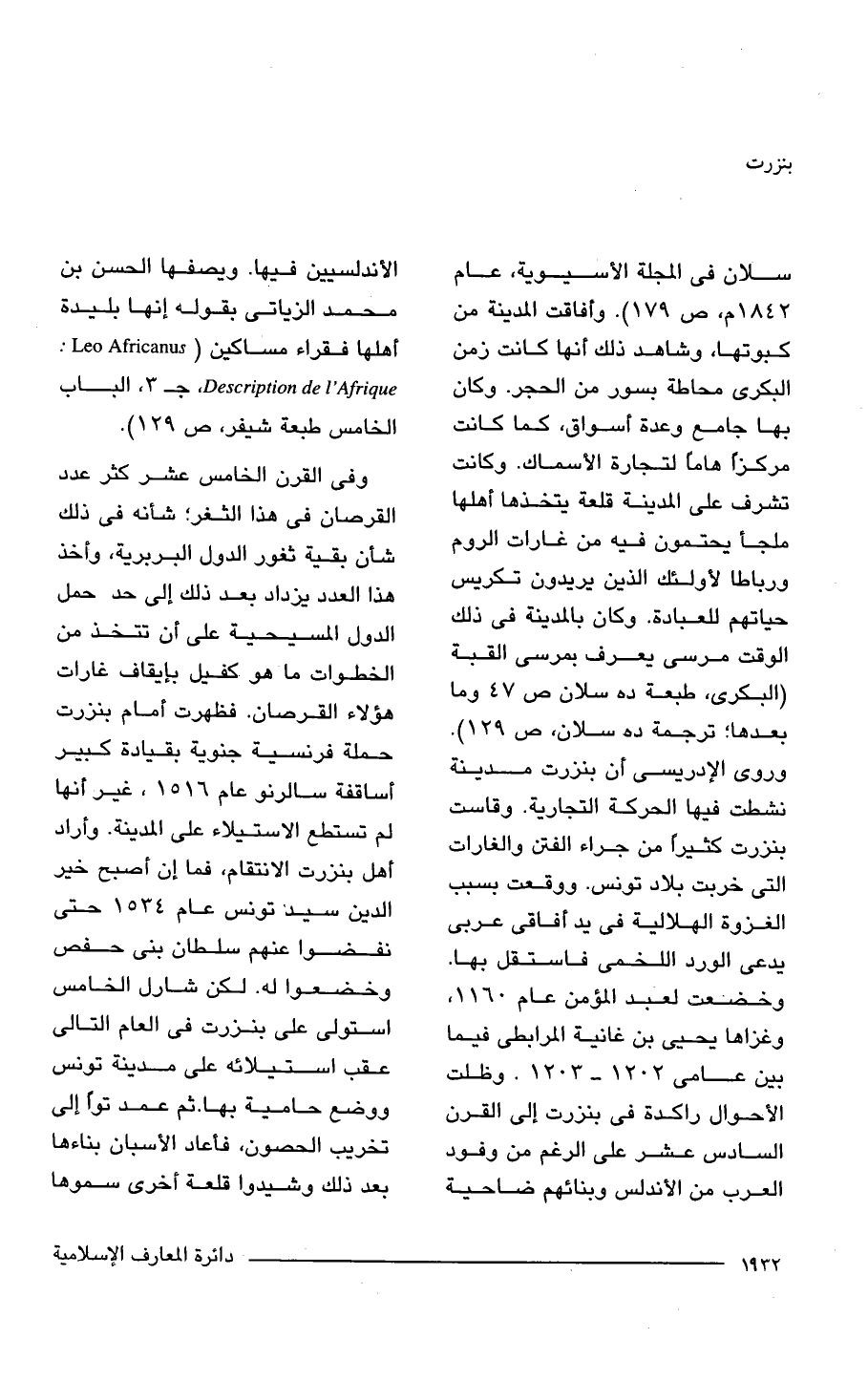 سلان في المجلة الأسيوية، عام 1842 م, ص 179) وأفاقت المدينة من كبوتها، وشاهد ذلك أنها كانت زمن البكرى محاطة بسور من الحجر. وكان بها جامع وعدة أسواق، كما كانت مركزًا هامًا لتجارة الأسماك. وكانت تشرف على المدينة قلعة يتخذها أهلها ملجأ يحتمون فيه من غارات الروم ورباطا لأولئك الذين يريدون تكريس حياتهم للعبادة. وكان بالمدينة في ذلك الوقت مرسى يعرف بمرسى القبة (البكرى، طبعة ده سلان ص 47 وما بعدها؛ ترجمة ده سلان، ص 129. وروى الإدريسي أن بنزرت مدينة نشطت فيها الحركة التجارية. وقاست بنزرت كثيرًا من جراء الفتن والغارات التي خربت بلاد تونس. ووقعت بسبب الغزوة الهلالية في يد أفاقى عربي يدعى الورد اللخمى فاستقل بها. وخضعت لعبد المؤمن عام 1160, وغزاها يحيى بن غانية المرابطى فيما بين عامي 1202 - 1203. وظلت الأحوال راكدة في بنزرت إلى القرن السادس عشر على الرغم من وفود العرب من الأندلس وبنائهم ضاحية الأندلسيين فيها. ويصفها الحسن بن محمد الزياتى بقوله إنها بليدة أهلها فقراء مساكين (. Leo Africanus . Description de l'Afrique, جـ 3, الباب الخامس طبعة شيفر، ص 129).