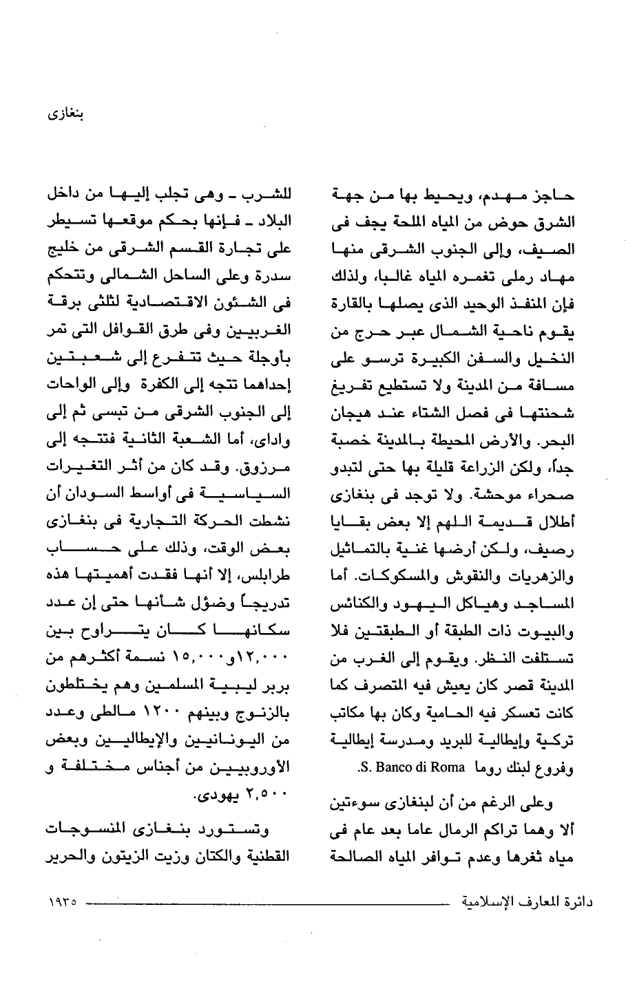 حاجز مهدم، ويحيط بها من جهة الشرق حوض من المياه الملحة يجف في الصيف، وإلى الجنوب الشرقي منها مهاد رملى تغمره المياه غالبا، ولذلك فإن المنفذ الوحيد الذي يصلها بالقارة يقوم ناحية الشمال عبر حرج من النخيل والسفن الكبيرة ترسو على مسافة من المدينة ولا تستطيع تفريغ شحنتها في فصل الشتاء عند هيجان البحر. والأرض المحيطة بالمدينة خصبة جدًّا، ولكن الزراعة قليلة بها حتى لتبدو صحراء موحشة. ولا توجد في بنغازى أطلال قديمة اللهم إلا بعض بقايا رصيف، ولكن أرضها غنية بالتماثيل والزهريات والنقوش والمسكوكات. أما المساجد وهياكل اليهود والكنائس والبيوت ذات الطبقة أو الطبقتين فلا تستلفت النظر. ويقوم إلى الغرب من المدينة قصر كان يعيش فيه المتصرف كما كانت تعسكر فيه الحامية وكان بها مكاتب تركية وايطالية للبريد ومدرسة إيطالية وفروع لبنك روما. s. Bancodi Roma