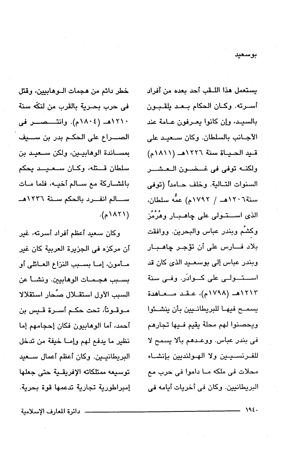 يستعمل هذا اللقب أحد بعده من أفراد أسرته. وكان الحكام بعد يلقبون بالسيد، وإن كانوا يعرفون عامة عند الأجانب بالسلطان. وكان سعيد على قيد الحياة سنة 1226 هـ (1811 م) ولكنه توفى في غضون العشر السنوات التالية. وخلف حامدًا (توفى سنة 1206 هـ / 1792 م) عمُّه سلطان، الذي استولى على جاهبار وهُرْمُز وكِشْم وبندر عباس والبحرين. ووافقت بلاد فارس على أن تؤجر جاهبار وبندر عباس إلى بوسعيد الذي كان قد استولى على كوادَر. وفي سنة 1213 هـ (1798 م)، عقد معاهدة يسمح فيها للبريطانيين بأن ينشئوا ويحصنوا لهم محلة يقيم فيها تجارهم في بندر عباس. ووعدهم بألا يسمح لا للفرنسيين ولا الهولنديين بإنشاء محلات في ملكه ما داموا في حرب مع البريطانيين. وكان في أخريات أيامه في خطر دائم من هجمات الوهابيين، وقتل في حرب بحرية بالقرب من لنكَه سنة 1210 هـ (1804 م). وانتصر في الصراع على الحكم بدر بن سيف بمساندة الوهابيين، ولكن سعيد بن سلطان قتله، وكان سعيد يحكم بالمشاركة مع سالم أخيه، فلما مات سالم انفرد بالحكم سنة 1236 هـ (1821 م).