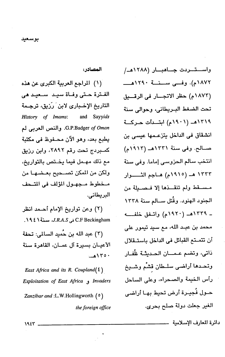 (1) المراجع العربية الكبرى عن هذه الفترة حتى وفاة سيد سعيد هي التاريخ الإخبارى لابن رَزيق، ترجمة History of Imams: and Sayyids j .G.P.Badger of Oman والنص العربي لم يطبع بعد، وهو الآن محفوظ في مكتبة كمبردج تحت رقم 2892, وابن رزيق مع ذلك مهمل فيما يختص بالتواريخ، ولكن من الممكن تصحيح بعضها من مخطوط مجهول المؤلف في المتحف البريطانى.