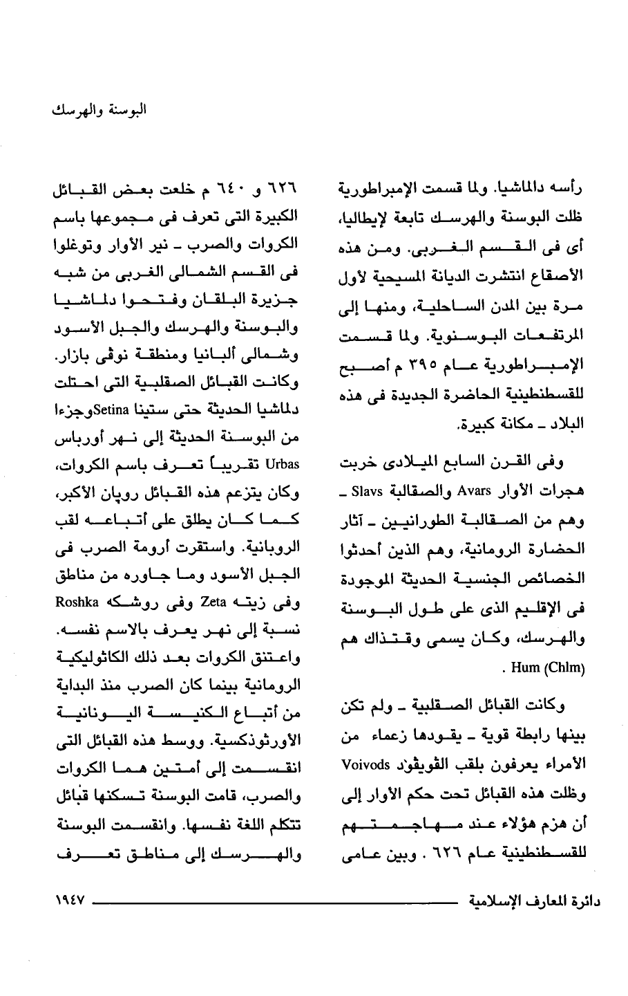 وفي القرن السابع الميلادي خربت هجرات الأوار Avars والصقالبة Slavs وهم من الصقالبة الطورانيين- آثار الحضارة الرومانية، وهم الذين أحدثوا الخصائص الجنسية الحديثة الموجودة في الإقليم الذي على طول البوسنة والهرسك، وكان يسمى وقتذاك هم Hum (Chlm) .