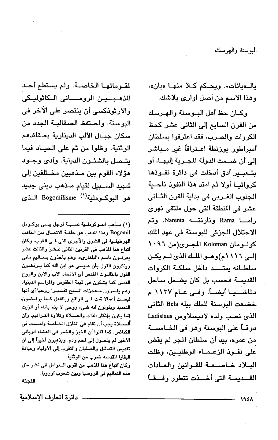 وكان حظ أهل البوسنة والهرسك من القرن السابع إلى الثاني عشر كحظ الكروات والصرب، فقد اعترفوا بسلطان إمبراطور بوزنطة اعترافًا غير مباشر إلى أن ضمت الدولة المجرية إليها، أو بتعبير أدق أدخلت في دائرة نفوذها كرواتيا أولًا ثم امتد هذا النفوذ ناحية الجنوب الغربي في بداية القرن الثاني عشر في المنطقة التي حول ملتقى نهرى راما Rama ونارنته Narenta. وتم الاحتلال الجزئى للبوسنة في عهد الملك كولومان Koloman المجرى (من 1096 إلى 1116 م) وهو الملك الذي لم يكن سلطانه يمتد داخل مملكة الكروات القديمة فحسب بل كان يشمل ساحل دلماشيا أيضًا. وفي عام 1137 م خضعت البوشنة للملك بيله Bela الثاني الذي نصب ولده لاديسلاوس Ladislaus دوقًا على البوسنة وهو في الخامسة من عمره، بيد أن سلطان المجر لم يقض على نفوذ الزعماء الوطنيين، وظلت البلاد خاصعة للقوانين والعادات القديمة التي أخذت تتطور وفقًا لمقوماتها الخاصة. ولم يستطع أحد المذهبين الروماني الكاثوليكى والأرثوذكسى أن ينتصر على الآخر في البوسنة. واحتفظ الصقالبة الجدد من سكان جبال الألب الدينارية بعقائدهم الوثنية. وظلوا من ثم على الحياد فيما يتصل بالشئون الدينية. وأدى وجود هؤلاء القوم بين مذهبين مختلفين إلى تمهيد السبيل لقيام مذهب دينى جديد هو البوكوملية (¬1) Bogomilisme الذي