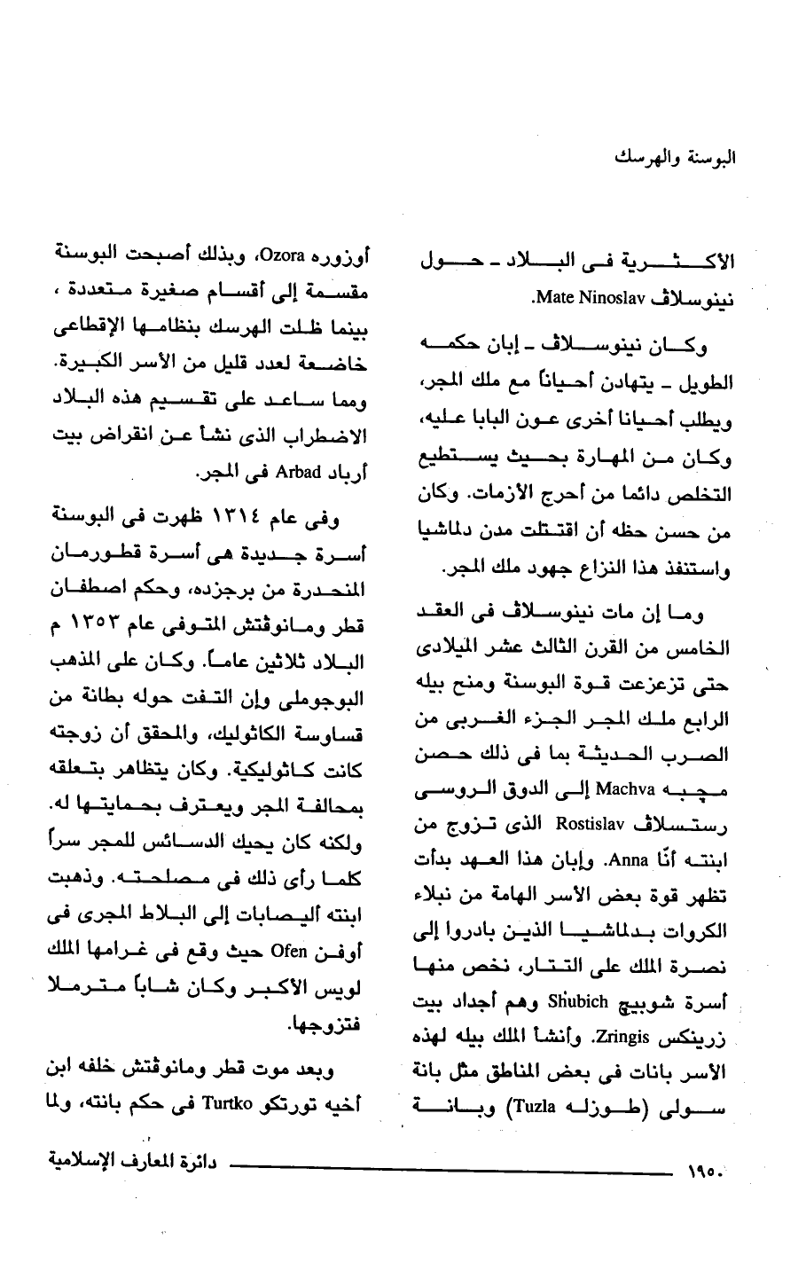 وما إن مات نينوسلاف في العقد الخامس من القرن الثالث عشر الميلادي حتى تزعزعت قوة البوسنة ومنح بيله الرابع ملك المجر الجزء الغربي من الصرب الحديثة بما في ذلك حصن مجبه Machva- إلى الدوق الروسى رستسلاف Rostislav الذي تزوج من ابنته أنّا Anna . وإبان هذا العهد بدأت تظهر قوة بعض الأسر الهامة من نبلاء الكروات بدلماشيا الذين بادروا إلى نصرة الملك على التتار، نخص منها أسرة شوبيج Shuhich وهم أجداد بيت زرينكس Zringis . وأنشأ الملك بيله لهذه الأسر بانات في بعض المناطق مثل بانة سولى (طوزله Tuzla) وبانة أوزوره Ozora , وبذلك أصبحت البوسنة مقسمة إلى أقسام صغيرة متعددة، بينما ظلت الهرسك بنظامها الإقطاعى خاضعة لعدد قليل من الأسر الكبيرة. ومما ساعد على تقسيم هذه البلاد الاضطراب الذي نشأ عن انقراض بيت Arbad أرباد في المجر.