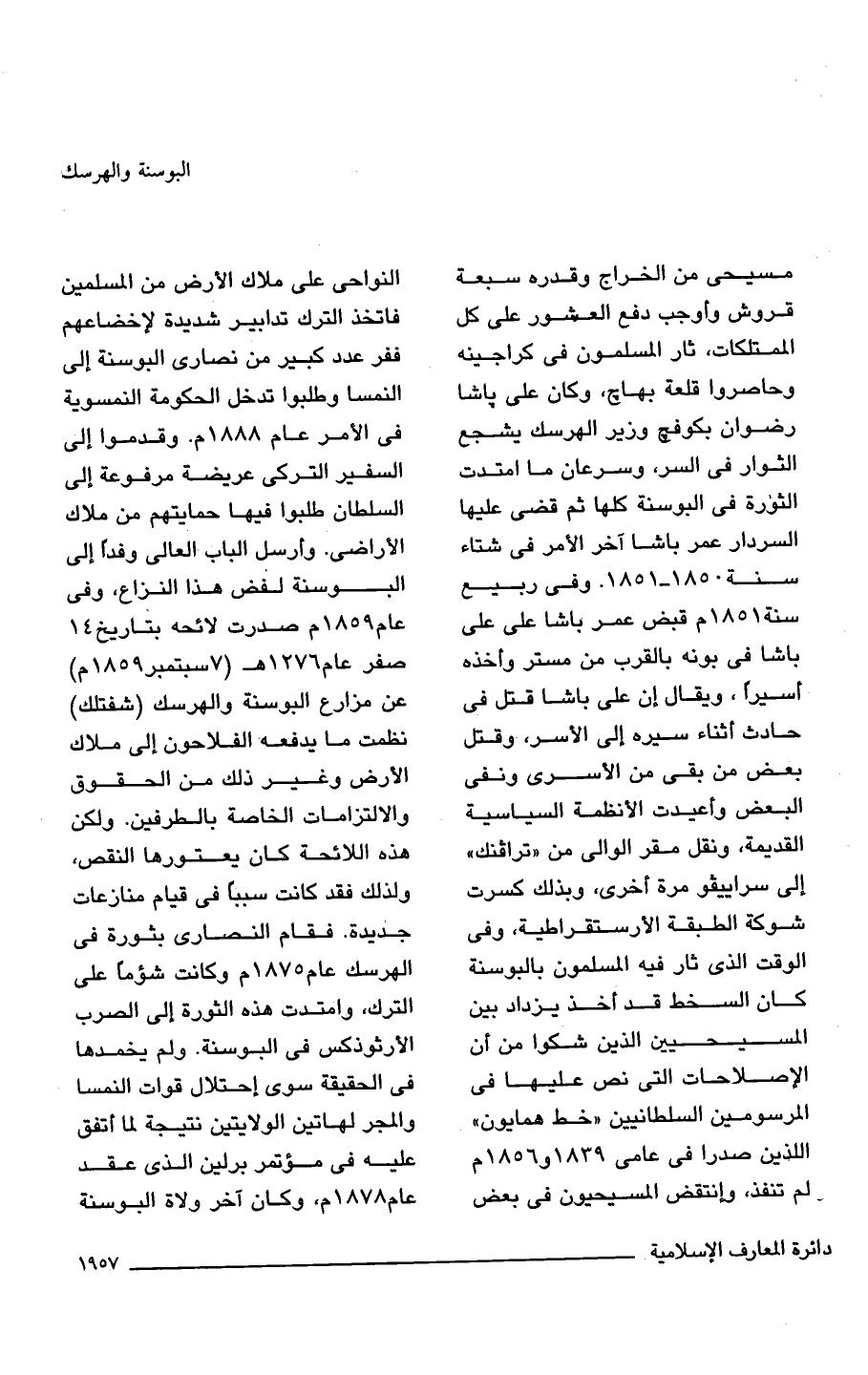 مسيحى من الخراج وقدره سبعة قروش وأوجب دفع العشور على كل الممتلكات، ثار المسلمون في كراجينه وحاصروا قلعة بهاج، وكان على باشا رضوان بكوفح وزير الهرسك يشجع الثوار في السر، وسرعان ما امتدت الثورة في البوسنة كلها ثم قضى عليها السردار عمر باشا آخر الأمر في شتاء سنة 1850 - 1851. وفي ربيع سنة 1851 م قبض عمر باشا على على باشا في بونه بالقرب من مستر وأخذه أسيرًا، ويقال إن على باشا قتل في حادث أثناء سيره إلى الأسر، وقتل بعض من بقى من الأسرى ونفى البعض وأعيدت الأنظمة السياسية القديمة، ونقل مقر الوالى من "ترافنك" إلى سراييفو مرة أخرى، وبذلك كسرت شوكة الطبقة الأرستقراطية، وفي الوقت الذي ثار فيه المسلمون بالبوسنة كان السخط قد أخذ يزداد بين المسيحيين الذين شكوا من أن الإصلاحات التي نص عليها في المرسومين السلطانيين "خط همايون" اللذين صدرا في عامي 1839 و 1856 م لم تنفذ، وانتقض المسيحيون في بعض النواحى على ملاك الأرض من المسلمين فاتخذ الترك تدابير شديدة لإخضاعهم ففر عدد كبير من نصارى البوسنة إلى النمسا وطلبوا تدخل الحكومة النمسوية في الأمر عام 1888 م. وقدموا إلى السفير التركى عريضة مرفوعة إلى السلطان طلبوا فيها حمايتهم من ملاك الأراضي. وأرسل الباب- العالى وفدًا إلى البوسنة لفض هذا النزاع، وفي عام 1859 م صدرت لائحه بتاريخ 14 صفر عام 1276 هـ (7 سبتمبر 1859 م) عن مزارع البوسنة والهرسك (شفتلك) نظمت ما يدفعه الفلاحون إلى ملاك الأرض وغير ذلك من الحقوق والالتزامات الخاصة بالطرفين. ولكن هذه اللائحة كان يعتورها النقص، ولذلك فقد كانت سببا في قيام منازعات جديدة. فقام النصارى بثورة في الهرسك عام 1875 م وكانت شؤمًا على الترك، وامتدت هذه الثورة إلى الصرب الأرثوذكس في البوسنة. ولم يخمدها في الحقيقة سوى إحتلال قوات النمسا والمجر لهاتين الولايتين نتيجة لما أتفق عليه في مؤتمر برلين الذي عقد عام 1878 م، وكان آخر ولاة البوسنة