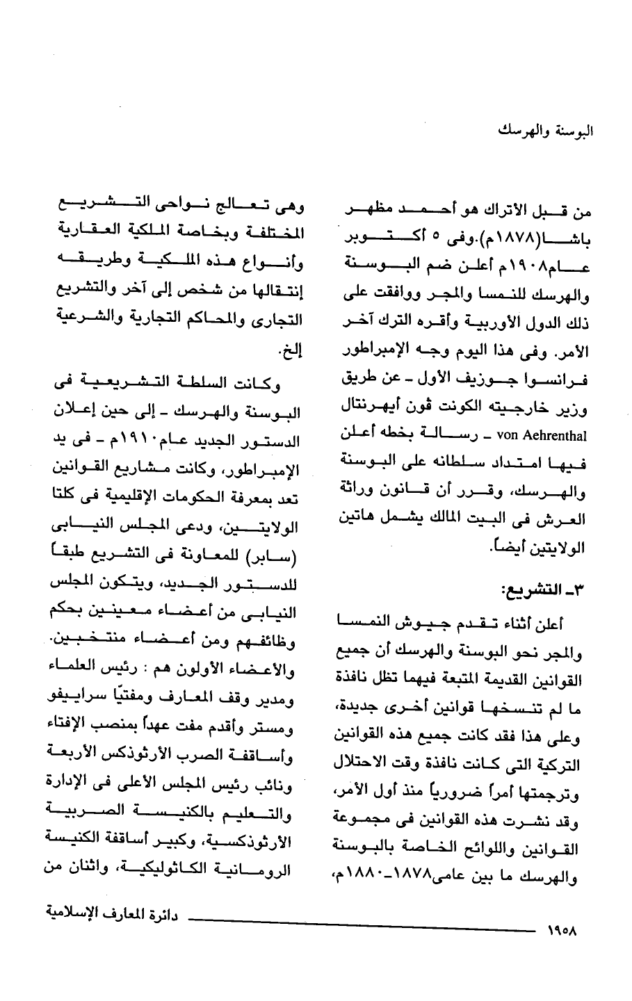 أعلن أثناء تقدم جيوش النمسا والمجر نحو البوسنة والهرسك أن جميع القوانين القديمة المتبعة فيهما تظل نافذة ما لم تنسخها قوانين أخرى جديدة، وعلى هذا فقد كانت جميع هذه القوانين التركية التي كانت نافذة وقت الاحتلال وترجمتها أمرًا ضروريًا منذ أول الأمر، وقد نشرت هذه القوانين في مجموعة القوانين واللوائح الخاصة بالبوسنة والهرسك ما بين.1878 - 1880 م، وهي شعالج نواحى التشريع المخللفة وبخاصة الملكية العقارية وأنواع هذه الملكية وطريقه إنتقالها من شخص إلى آخر والتشريع التجارى والمحاكم التجارية والشرعية إلخ.