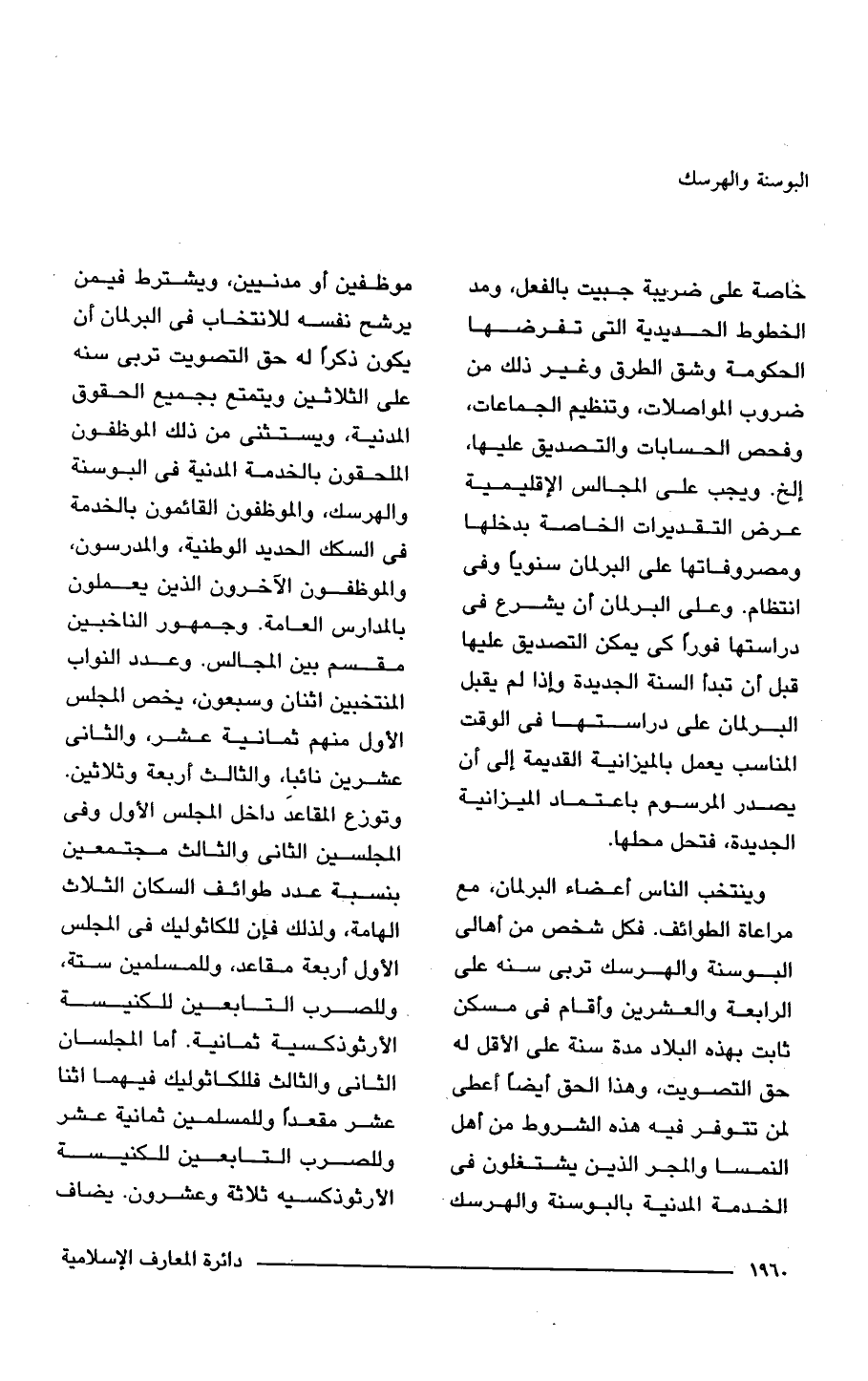 وينتخب الناس أعضاء البرلمان، مع مراعاة الطوائف. فكل شخص من أهالى البوسنة والهرسك تربى سنه على الرابعة والعشرين وأقام في مسكن ثابت بهذه البلاد مدة سنة على الأقل له حق التصويت، وهذا الحق أيضًا أعطى لمن تتوفر فيه هذه الشروط من أهل النمسا والمجر الذين يشتغلون في الخدمة المدنية بالبوسنة والهرسك- موظفين أو مدنيين، ويشترط فيمن يرشح نفسه للانتخاب في البرلمان أن يكون ذكرًا له حق التصويت تربى سنه على الثلاثين ويتمتع بجميع الحقوق المدنية، ويستثنى من ذلك الموظفون الملحقون بالخدمة المدنية في البوسنة والهرسك، والموظفون القائمون بالخدمة في السكك الحديد الوطنية، والمدرسون، والموظفون الآخرون الذين يعملون بالمدارس العامة. وجمهور الناخبين مقسم بين المجالس. وعدد النواب المنتخبين اثنان وسبعون، يخص المجلس الأول منهم ثمانية عشر، والثاني عشرين نائبا، والثالث أربعة وثلاثين.