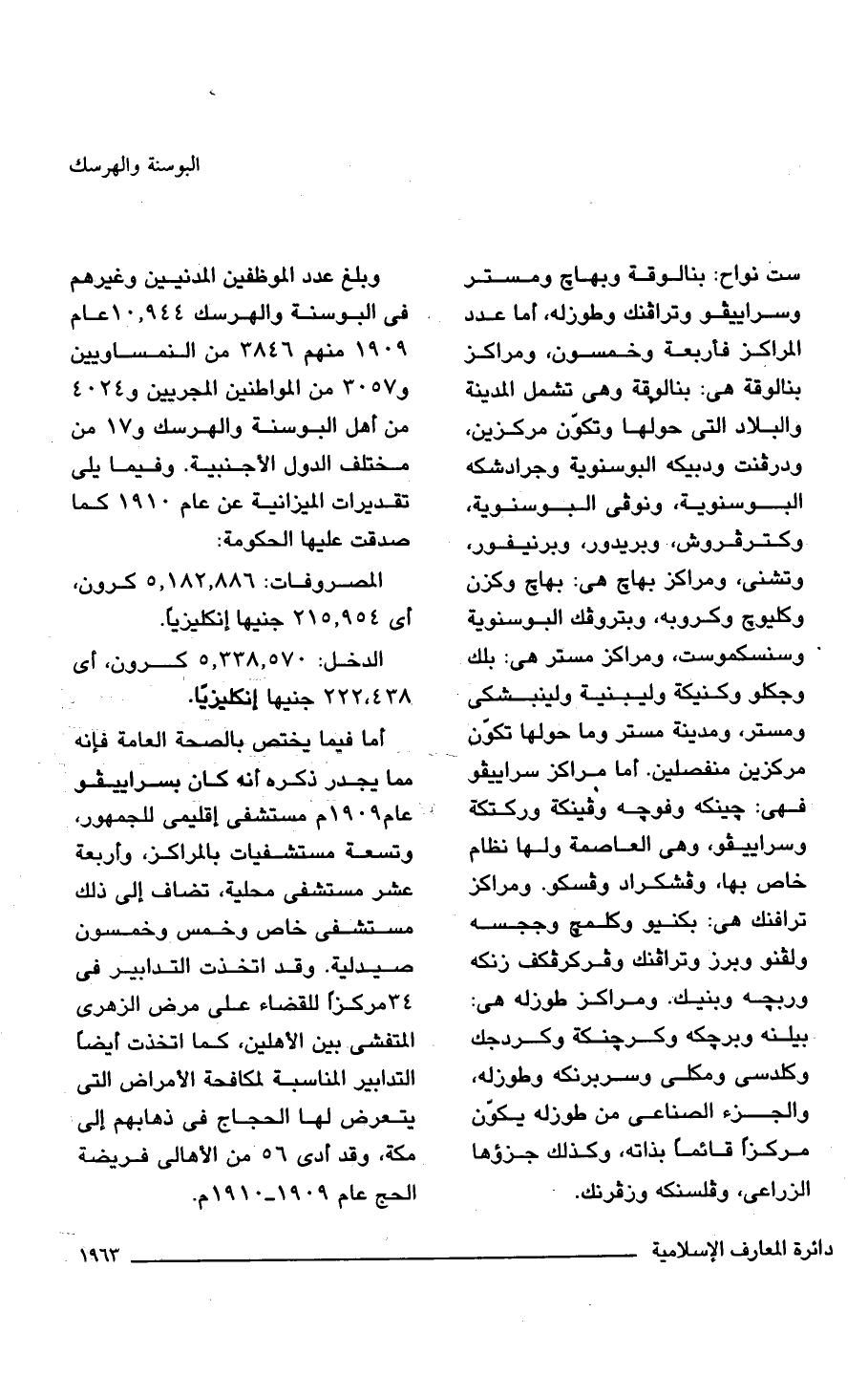 ست نواح: بنالوقة وبهاج ومستر وسراييفو وترافنك وطوزله، أما عدد المراكز فأربعة وخمسون، ومراكز بنالوقة هي: بنالوقة وهي تشمل المدينة والبلاد التي حولها وتكوّن مركزين، ودرفنت ودبيكه البوسنوية وجرادشكه البوسنوية، ونوفى البوسنوية، وكترفروش، وبريدور، وبرنيفور، وتشنى، ومراكز بهاج هي: بهاج وكزن وكليوج وكروبه، وبتروفك البوسنوية وسنسكموست، ومراكز مستر هي: بلك وجكلو وكنيكة وليبنية ولينبشكى ومستر، ومدينة مستر وما حولها تكوّن مركزين منفصلين. أما مراكز سراييفو فهي: جينكه وفوجه وفينكة وركتكة وسراييفو، وهي العاصمة ولها نظام خاص بها، وفشكراد وفسكو. ومراكز ترافنك هي: بكنيو وكلمج وججسه ولفنو وبرز وترافنك وفركرفكف زنكه وربجه وبنيك. ومراكز طوزله هي: بيلنه وبرجكه وكرجنكة وكردجك وكلدسى ومكلى وسربرنكه وطوزله، والجزء الصناعى من طوزله يكوّن مركزًا قائمًا بذاته، وكذلك جزؤها الزراعى، وفلسنكه وزفرنك.
