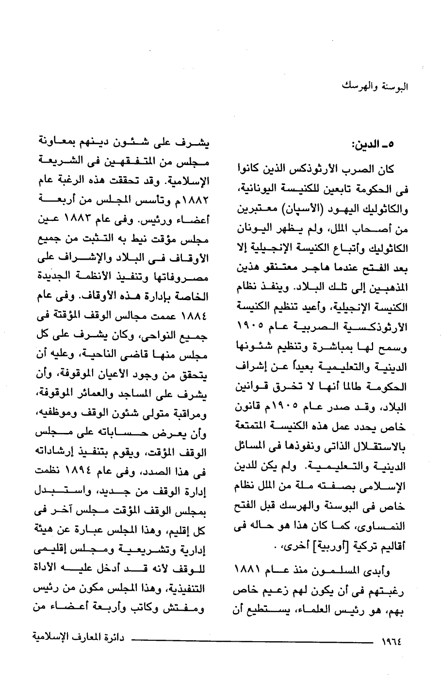 كان الصرب الأرثوذكس الذين كانوا في الحكومة تابعين للكنيسة اليونانية، والكاثوليك اليهود (الأسيان) معتبرين من أصحاب الملل، ولم يظهر اليونان الكاثوليك وأتباع الكنيسة الإنجيلية إلا بعد الفتح عندما هاجر معتنقو هذين المذهبين إلى تلك البلاد. وينفذ نظام الكنيسة الإنجيلية، وأعيد تنظيم الكنيسة الأرثوذكسية الصربية عام 1905 وسمح لها بمباشرة وتنظيم شئونها الدينية والتعليمية بعيدلم عن إشراف الحكومة طالما أنها لا تخرق قوانين البلاد، وقد صدر عام 1905 م قانون خاص يحدد عمل هذه الكنيسة المتمتعة بالاستقلال الذاتى ونفوذها في المسائل الدينية والتعليمية. ولم يكن للدين الإسلام بصفته ملة من الملل نظام خاص في البوسنة والهرسك قبل الفتح النمساوى، كما كان هذا هو حاله في أقاليم تركية [أوربية] أخرى.