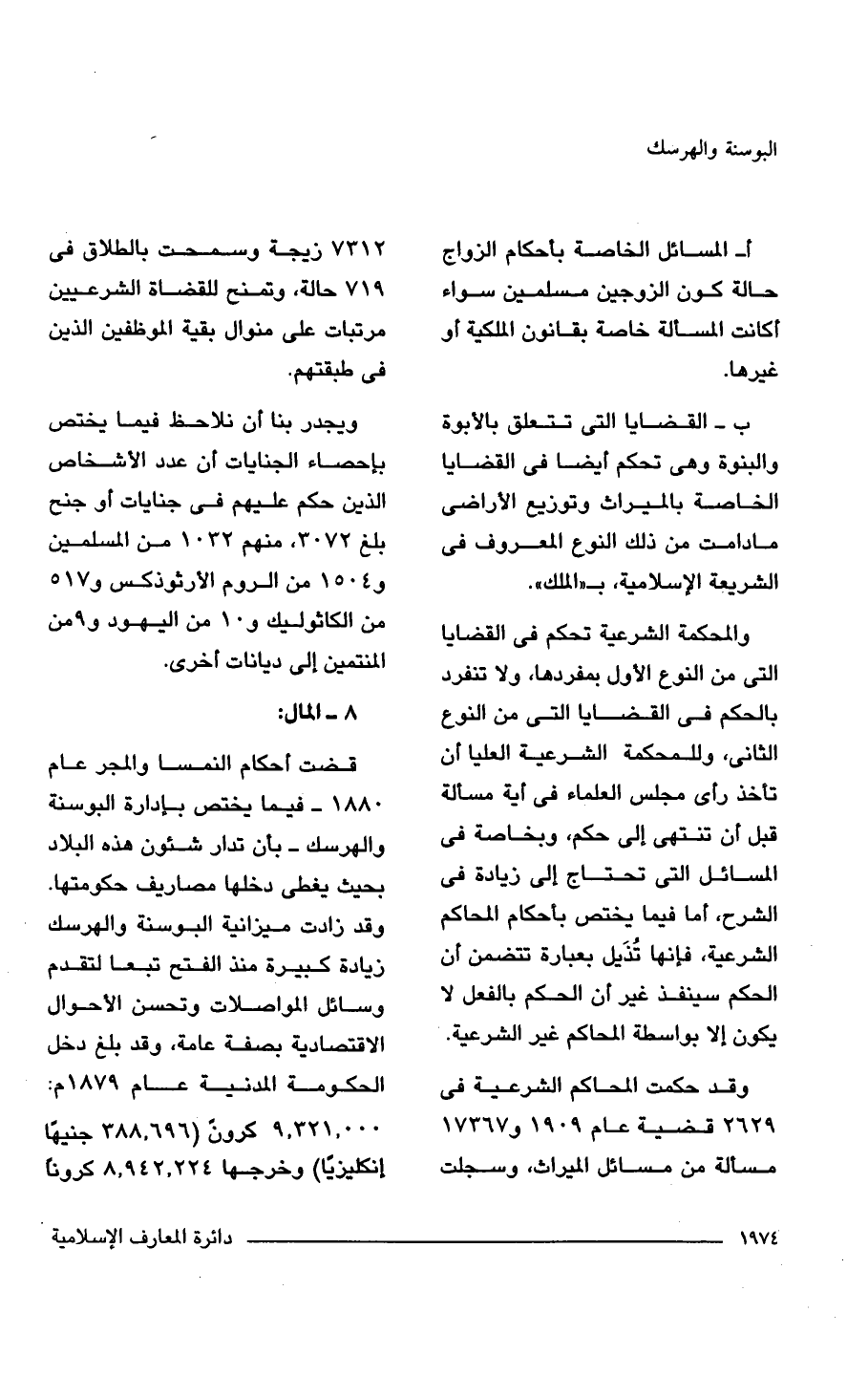 وقد حكمت المحاكم الشرعية في 2629 قضية عام 1909 و 17367 مسألة من مسائل الميراث، وسجلت 7312 زيجة وسمحت بالطلاق في 719 حالة، وتمنح للقضاة الشرعيين مرتبات على منوال بقية الموظفين الذين في طبقتهم.