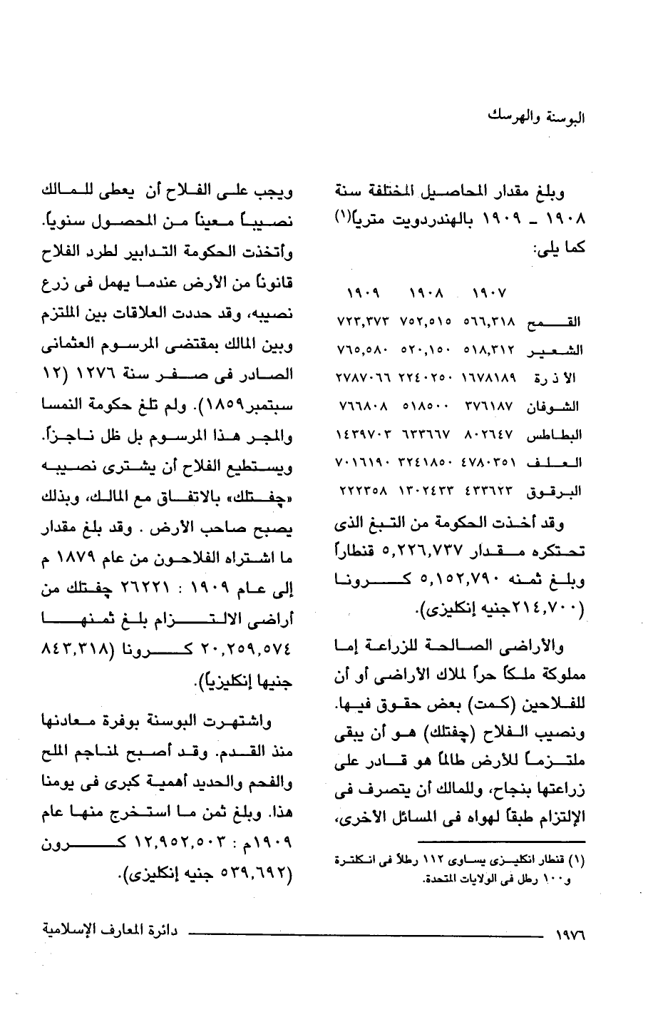 وبلغ مقدار المحاصيل المختلفة سنة 1908 - 1909 بالهندردويت متريًا (¬1) كما يلي: