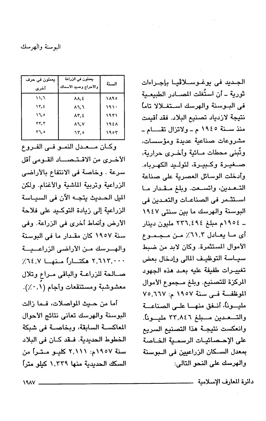 الجديد في يوغوسلافيا بإجراءات ثورية- أن استُغلت المصادر الطبيعية في البوسنة والهرسك استغلالا تامًّا نتيجة لازدياد تصنيع البلاد. فقد أقيمت منذ سنة 1945 م- ولا تزال تقام- مشروعات صناعية عديدة ومؤسسات، وتبنى محطات مائية وأخرى حرارية، صغيرة وكبيرة، لتوليد الكهرباء. وأدخلت الوسائل العصرية على صناعة التعدين، واتسعت. وبلغ مقدار ما استثمر في الصناعات والتعدين في البوسنة والهرسك ما بين سنتى 1947 - 1954 م مبلغ 236.494 مليون دينار أي ما يعادل 61.3 % من مجموع الأموال المستثمرة. وكان لا بد من ضبط سياسة التوظيف المالى وإدخال بعض تغييرات طفيفة عليه بعد هذه الجهود المركزة للتصنيع. وبلغ مجموع الأموال الموظفة في سنة 1957 م: 75.667 مليونًا، أنفق منها على الصناعة والتعدين مبلغ 33.846 مليونًا. وانعكست نتيجة هذا التصنيع السريع على الإحصائيات الرسمية الخاصة بمعدل السكان الزراعيين في البوسنة والهرسك على النحو التالي: