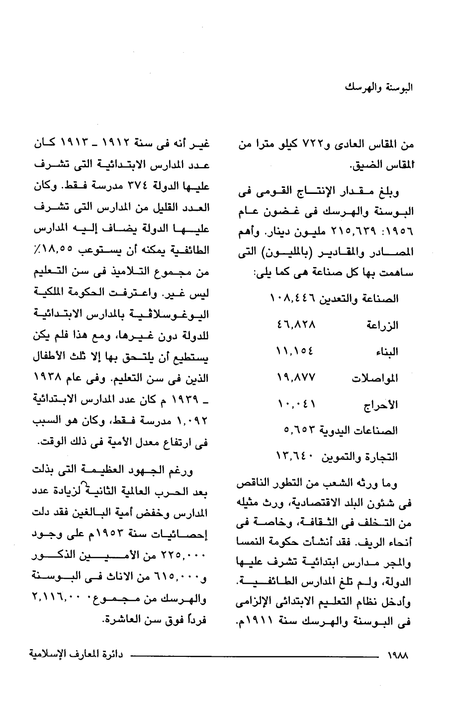 وبلغ مقدار الإنتاج القومى في البوسنة والهرسك في غضون عام 1956: 215.639 مليون دينار. وأهم المصادر والمقادير (بالمليون) التي ساهمت بها كل صناعة هي كما يلي: