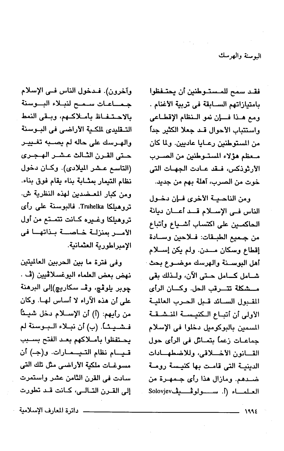 ومن الناحية الأخرى فإن دخول الناس في الإسلام قد أعان ديانة الحاكمين على اكتساب أشياع وأتباع من جميع الطبقات: فلاحين وسادة إقطاع وسكان مدن. ولم يكن إسلام أهل البوسنة والهرسك موضوع بحث شامل كامل حتى الآن، ولذلك بقى مشكلة تترقب الحل. وكان الرأى المقبول السائد قبل الحرب العالمية الأولى أن أتباع الكنيسة المنشقة المسمين بالبوكوميل دخلوا في الإسلام جماعات زعمًا بتماثل في الرأى حول القانون الأخلاقى، وللاضطهادات الدينية التي قامت بها كنيسة رومة ضدهم. وما زال هذا رأى جمهرة من العلماء (أ. سولوفيف Solovjev وآخرون). فدخول الناس في الإسلام جماعات سمح لنبلاء البوسنة بالاحتفاظ بأملاكهم، وبقى النمط التقليدى لملكية الأراضي في البوسنة والهرسك على حاله لم يصبه تغيير حتى القرن الثالث عشر الهجرى (التاسع عشر الميلادي). وكان دخول نظام التيمار بمثابة بناء يقام فوق بناء. ومن كبار المعضدين لهذه النظرية ش. تروهيلكا Truhelka. فالبوسنة على رأى تروهيلكا وغيره كانت تتمتع من أول الأمر بمنزلة خاصة بذاتها في الإمبراطورية العثمانية.