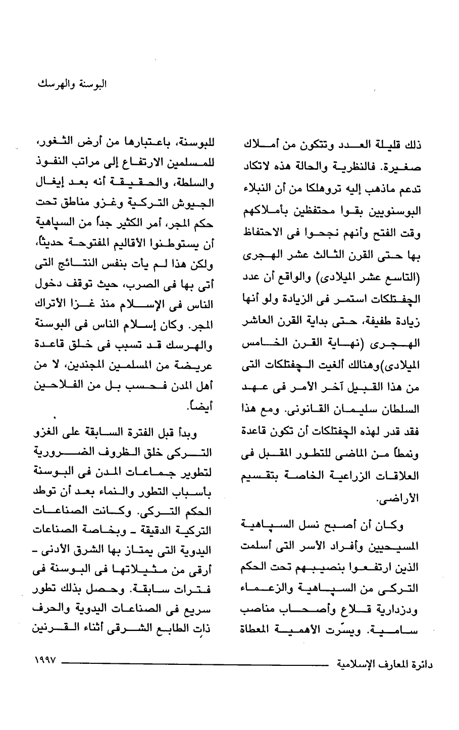ذلك قليلة العدد وتتكون من أملاك صغيرة. فالنظرية والحالة هذه لاتكاد تدعم ماذهب إليه تروهلكا من أن النبلاء البوسنويين بقوا محتفظين بأملاكهم وقت الفتح وأنهم نجحوا في الاحتفاظ بها حتى القرن الثالث عشر الهجرى (التاسع عشر الميلادي) والواقع أن عدد الجفتلكات استمر في الزيادة ولو أنها زيادة طفيفة، حتى بداية القرن العاشر الهجرى (نهاية القرن الخامس الميلادي) وهنالك ألغيت الجفتلكات التي من هذا القبيل آخر الأمر في عهد السلطان سليمان القانونى. ومع هذا فقد قدر لهذه الجفتلكات أن تكون قاعدة ونمطًا من الماضي للتطور المقبل في العلاقات الزراعية الخاصة بتقسيم الأراضي.