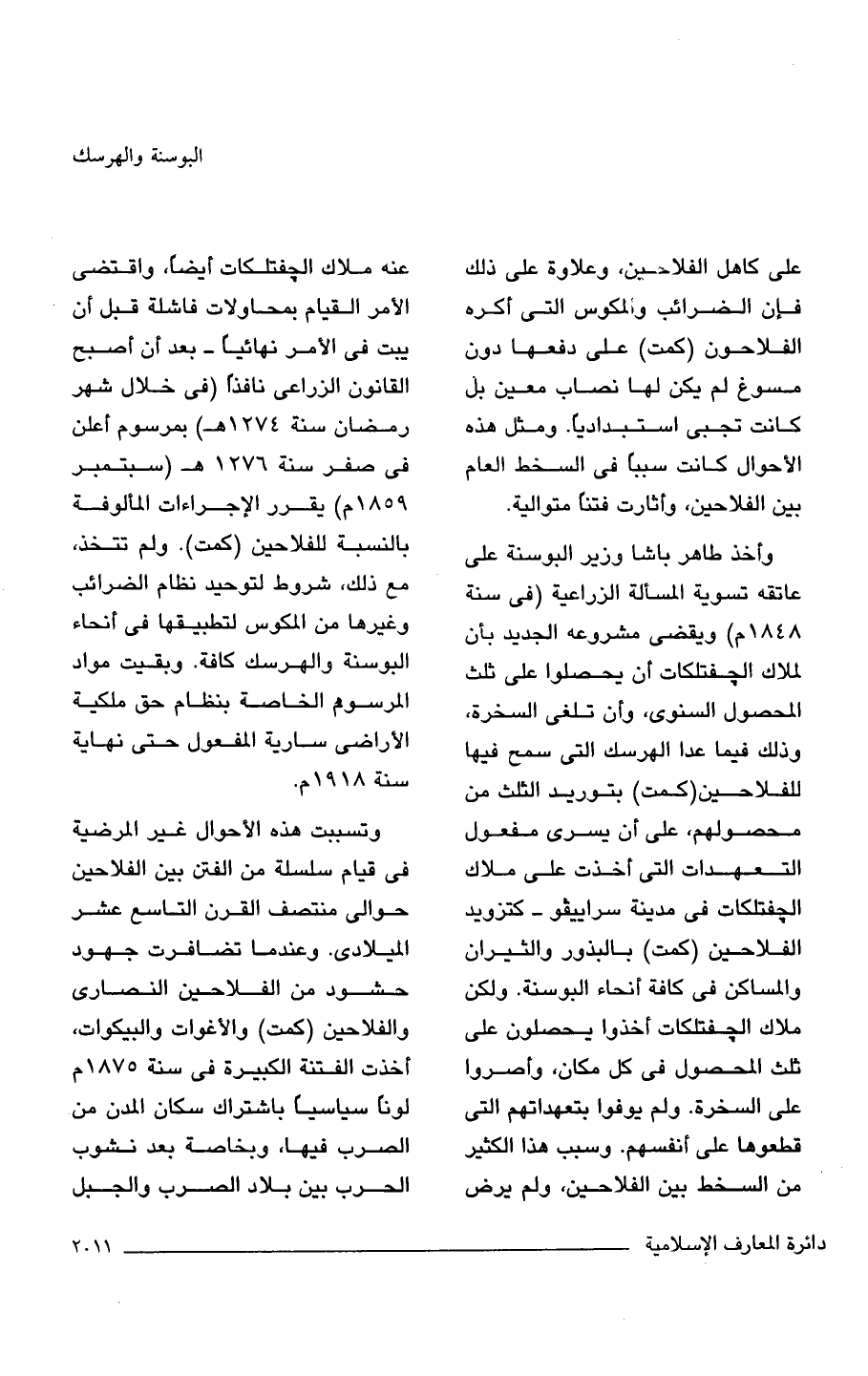 وأخذ طاهر باشا وزير البوسنة على عاتقه تسوية المسألة الزراعية (في سنة 1848 م) ويقضى مشروعه الجديد بأن لملاك الجفتلكات أن يحصلوا على ثلث المحصول السنوى، وأن تلغى السخرة، وذلك فيما عدا الهرسك التي سمح فيها للفلاحين (كمت) بتوريد الثلث من محصولهم، على أن يسرى مفعول التعهدات التي أخذت على ملاك الجفتلكات في مدينة سراييفو- كتزويد الفلاحين (كمت) بالبذور والثيران والمساكن في كافة أنحاء البوسنة. ولكن ملاك الجفتلكات أخذوا يحصلون على ثلث المحصول في كل مكان، وأصروا على السخرة. ولم يوفوا بتعهداتهم التي قطعوها على أنفسهم. وسبب هذا الكثير من السخط بين الفلاحين، ولم يرض عنه ملاك الجفتلكات أيضًا، واقتضى الأمر القيام بمحاولات فاشلة قبل أن يبت في الأمر نهائيًا- بعد أن أصبح القانون الزراعى نافذًا (في خلال شهر رمضان سنة 1274 هـ) بمرسوم أعلن في صفر سنة 1276 هـ (سبتمبر 1859 م) يقرر الإجراءات المألوفة بالنسبة للفلاحين (كمت). ولم تتخذ، مع ذلك، شروط لتوحيد نظام الضرائب وغيرها من المكوس لتطبيقها في أنحاء البوسنة والهرسك كافة. وبقيت مواد المرسوم الخاصة بنظام حق ملكية الأراضي سارية المفعول حتى نهاية سنة 1918 م.