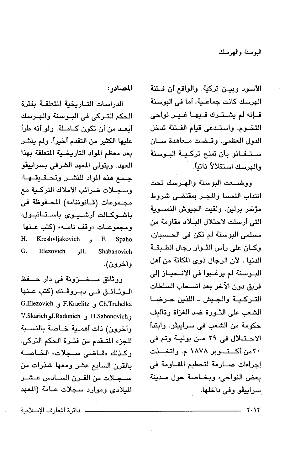 الدراسات التاريخية المتعلقة بفترة الحكم التركى في البوسنة والهرسك أبعد من أن تكون كاملة. ولو أنه طرأ عليها الكثير من التقدم أخيرًا. ولم ينشر بعد معظم المواد التاريخية المتعلقة بهذا العهد. ويتولى المعهد الشرقي بسراييفو جمع هذه المواد للنشر وتحقيقها، وسجلات ضرائب الأملاك التركية مع مجموعات (قانوننامه) المحفوظة في باشوكالت أرشيوى باستانبول، ومجموعات "وقف نامه" (كتب عنها F. Spaho و H. Kreshvljakovich H. Shabanovich و G. Elezovich وآخرون).