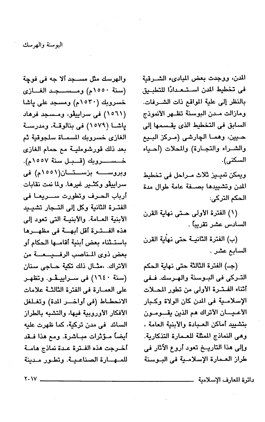 (جـ) الفترة الثالثة حتى نهاية الحكم التركى في البوسنة والهرسك. ففي أثناء الفترة الأولى من تطور المحلات الإسلامية في المدن كان الولاة وكبار الأعيان الأتراك هم الذين يقومون بتشييد أماكن العبادة والأبنية العامة، وهي النماذج الممثلة للعمارة التذكارية. وإلى هذا التاريخ تعود أروع الآثار في طراز العمارة الإسلامية في البوسنة والهرسك مثل مسجد ألا جه في فوجة (سنة 1550 م) ومسجد الغازى خسروبك (1530 م) ومسجد على باشا (1561) في سراييفو، ومسجد فرهاد باشا (1579) في بنالوقة، ومدرسة الغازى خسروبك المسماة سلجوقية ثم بعد ذلك قورشوملية مع حمام الغازى خسروبك (قبل سنة 1557 م). وبروسه بزستان (1551 م) في سراييفو وكثير غيرها. ولما نمت نقابات أرباب الحرف وتطورت سريعا في الفترة الثانية وكل إلى التجار تشييد الأبنية العامة. والأبنية التي تعود إلى هذه الفترة أقل أبهة في مظهرها باستثناء بعض أبنية أقامها الحكام أو بعض ذوي المناصب الرفيعة من الأتراك.، مثال ذلك تكية حاجى سنان (سنة 1640) في سراييفو. وتظهر على العمارة في الفترة الثالثة علامات الانحطاط (في أواخر المدة) وتغلغل الأفكار الأوروبية فيها، والتشبه بالطراز السائد في مدن تركية، كما ظهرت عليه أيضًا مؤثرات مباشرة. ومع هذا فقد أخرجت هذه الفترة عدة نماذج هامة للمهارة الصناعية. وتطور مدينة