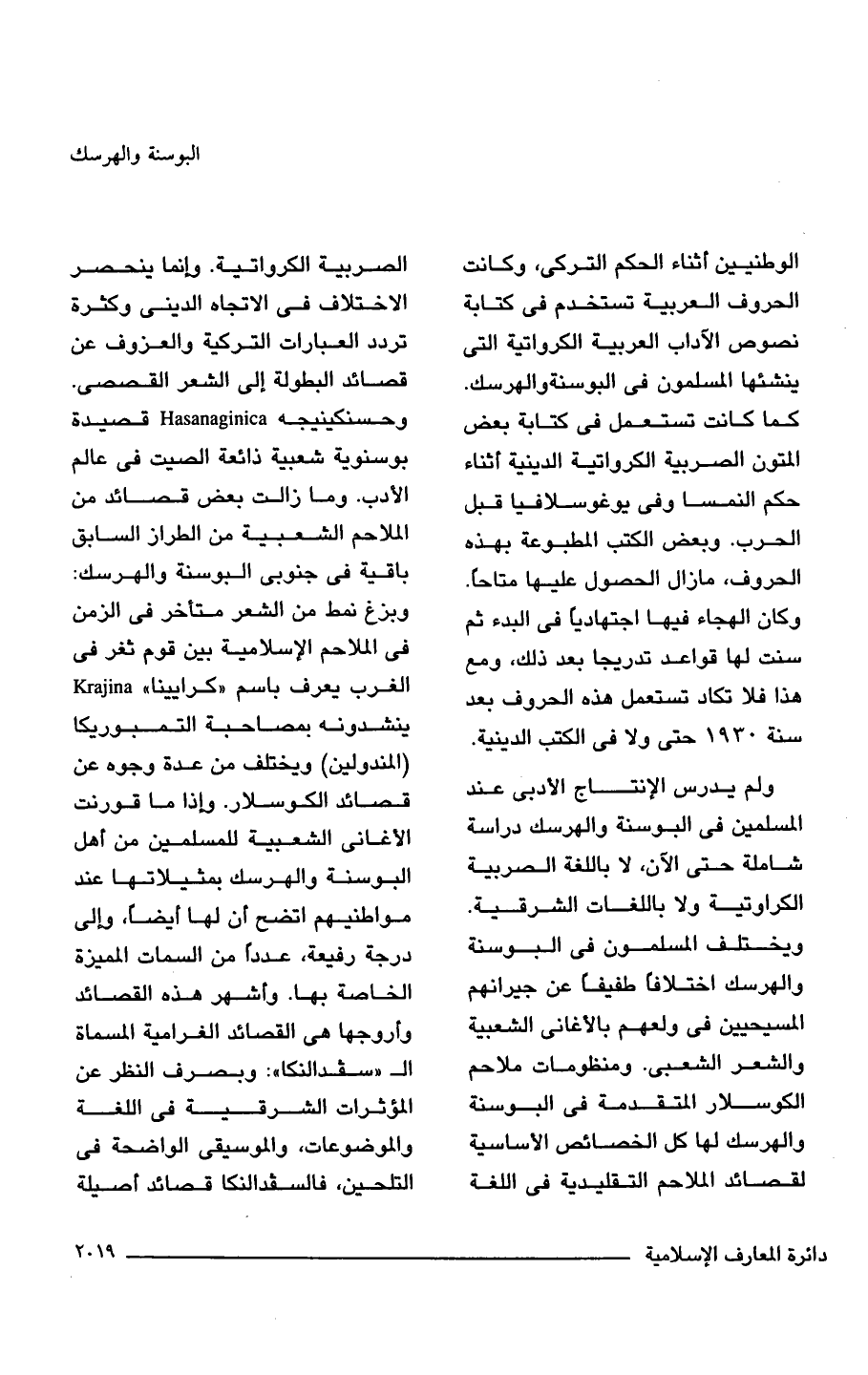 الوطنيين أثناء الحكم التركى، وكانت الحروف العربية تستخدم في كتابة نصوص الآداب العربية الكرواتية التي ينشئها المسلمون في البوسنة والهرسك. كما كانت تستعمل في كتابة بعض المتون الصربية الكرواتية الدينية أثناء حكم النمسا وفي يوغوسلافيا قبل الحرب. وبعض الكتب المطبوعة بهذه الحروف، مازال الحصول عليها متاحًا. وكان الهجاء فيها اجتهاديًا في البدء ثم سنت لها قواعد تدريجا بعد ذلك، ومع هذا فلا تكاد تستعمل هذه الحروف بعد سنة 1930 حتى ولا في الكتب الدينية.