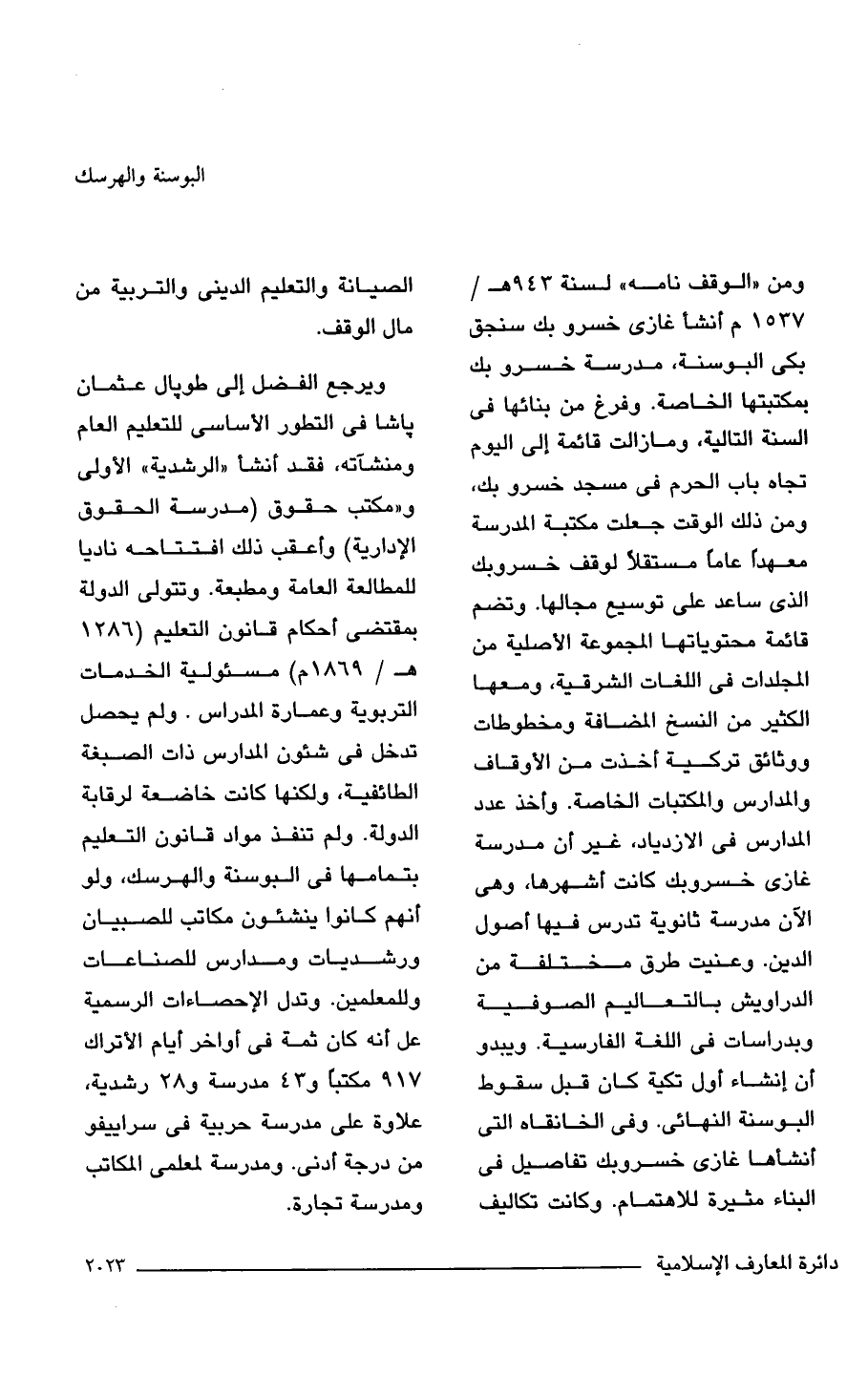 ومن "الوقف نامه" لسنة 943 هـ / 1537 م انشأ غازى خسرو بك سنجق بكى البوسنة، مدرسة خسرو بك بمكتبتها الخاصة. وفرغ من بنائها في السنة التالية، ومازالت قائمة إلى اليوم تجاه باب الحرم في مسجد خسرو بك، ومن ذلك الوقت جعلت مكتبة المدرسة معهدًا عامًا مستقلًا لوقف خسروبك الذي ساعد على توسيع مجالها. وتضم قائمة محتوياتها المجموعة الأصلية من المجلدات في اللغات الشرقية، ومعها الكثير من النسخ المضافة ومخطوطات ووثائق تركية أخذت من الأوقاف والمدارس والمكتبات الخاصة. وأخذ عدد المدارس في الازدياد، غير أن مدرسة غازى خسروبك كانت أشهرها، وهي الآن مدرسة ثانوية تدرس فيها أصول الدين. وعنيت طرق مختلفة من الدراويش بالتعاليم الصوفية وبدراسات في اللغة الفارسية. ويبدو أن إنشاء أول تكية كان قبل سقوط البوسنة النهائى. وفي الخانقاه التي أنشأها غازى خسروبك تفاصيل في البناء مثيرة للاهتمام. وكانت تكاليف الصيانة والتعليم الدينى والتربية من مال الوقف.