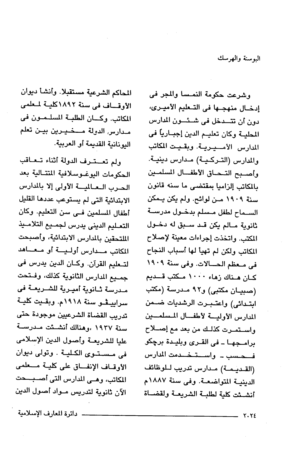 ولم تعترف الدولة أثناء تعاقب الحكومات اليوغوسلافية المتتالية بعد الحرب العالمية الأولى إلا بالمدارس الابتدائية التي لم يستوعب عددها القليل أطفال المسلمين في سن التعليم. وكان التعليم الدينى يدرس لجميع التلاميذ الملتحقين بالمدارس الابتدائية، وأصبحت المكاتب مدارس أولية أو معاهد لتعليم القرآن. وكان الدين يدرس في جميع المدارس الثانوية كذلك، وفتحت مدرسة ثانوية أميرية للشريعة في سراييفو سنة 1918 م. وبقيت كلية تدريب القضاة الشرعيين موجودة حتى سنة 1937، وهنالك أنشئت مدرسة عليا للشريعة وأصول الدين الإسلامي في مستوى الكلية. وتولى ديوان الأوقاف الإنفاق على كلية معلمى المكاتب، وهي المدارس التي أصبحت الآن ثانوية لتدريس مواد أصول الدين
