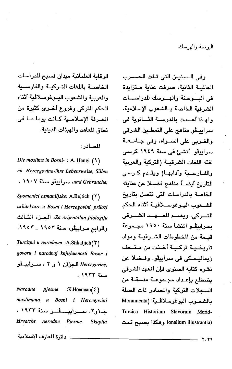 وفي السنين التي تلت الحرب العالمية الثانية، صرفت عناية متزايدة في البوسنة والهرسك للدراسات الشرقية الخاصة بالشعوب الإسلامية، ولهذا أعدت بالمدرسة الثانوية في سراييفو مناهج على النمطين الشرقي والغربى على السواء، وفي جامعة سراييفو أنشئ في سنة 1949 كرسى لفقه اللغات الشرقية (التركية والعربية والفارسية وآدابها) ويقدم كرسى التاريخ أيضًا مناهج فضلا عن عنايته الخاصة بالدراسات التي تتصل بتاريخ الشعوب اليوغوسلافية أثناء الحكم التركى. ويضم المعهد الشرقي بسراييفو المنشأ سنة. 1950 مجموعة قيمة من المخطوطات الشرقية ومواد تاريخية تركية أخذت من متحف زيماليسكى في سراييفو. وفضلا عن نشره كتابه السنوى فإن المعهد الشرقي يضطلع بإعداد مجموعة منسقة من السجلات التركية والمصادر ذات الصلة بالشعوب اليوغوسلافية (Monumenta -Turcica Historiam Slavorum Merid ionalium illustrantia) وهكذا يصبح تحت الرقابة العلمانية ميدان فسيح للدراسات الخاصة باللغات التركية والفارسية والعربية والشعوب اليوغوسلافية أثناء الحكم التركى وفروع أخرى كثيرة من المعرفة الإسلامية كانت يوما ما في نطاق المعاهد والهيئات الدينية.