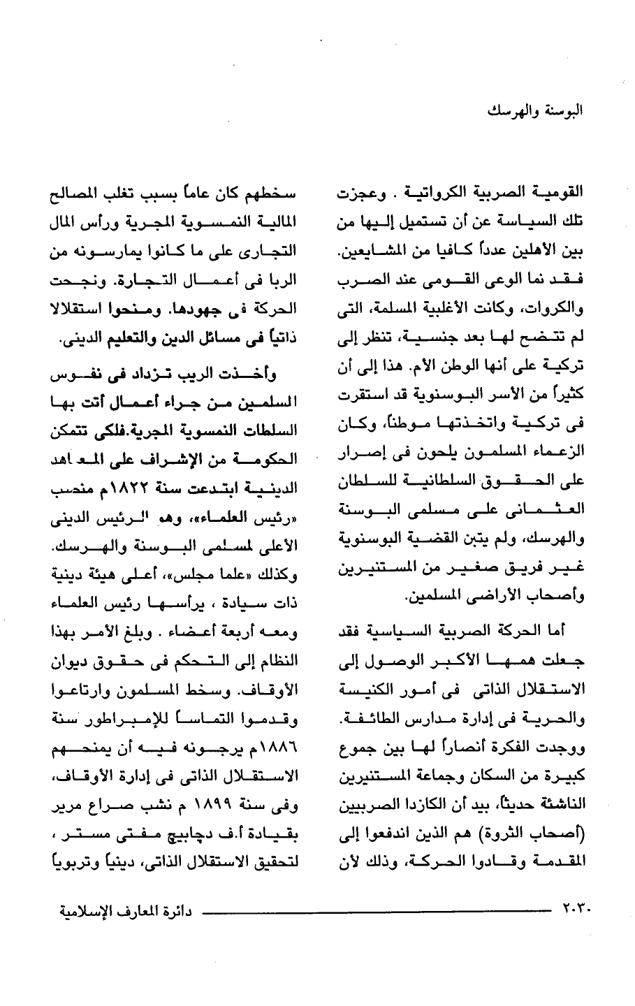 القومية الصربية الكرواتية. وعجزت للك السياسة عن أن تستميل إليها من بين الأهلين عددًا كافيا من المشايعين. فقد نما الوعى القومى عند الصرب والكروات، وكانت الأغلبية المسلمة، التي لم تتضح لها بعد جنسية، تنظر إلى تركية على أنها الوطن الأم. هذا إلى أن كثيرًا من الأسر البوسنوية قد استقرت في تركية واتخذتها موطنًا، وكان الزعماء المسلمون يلحون في إصرار على الحقوق السلطانية للسلطان العثمانى على مسلمي البوسنة والهرسك، ولم يتبن القضية البوسنوية غير فريق صغير من المستنيرين وأصحاب الأراضي المسلمين.