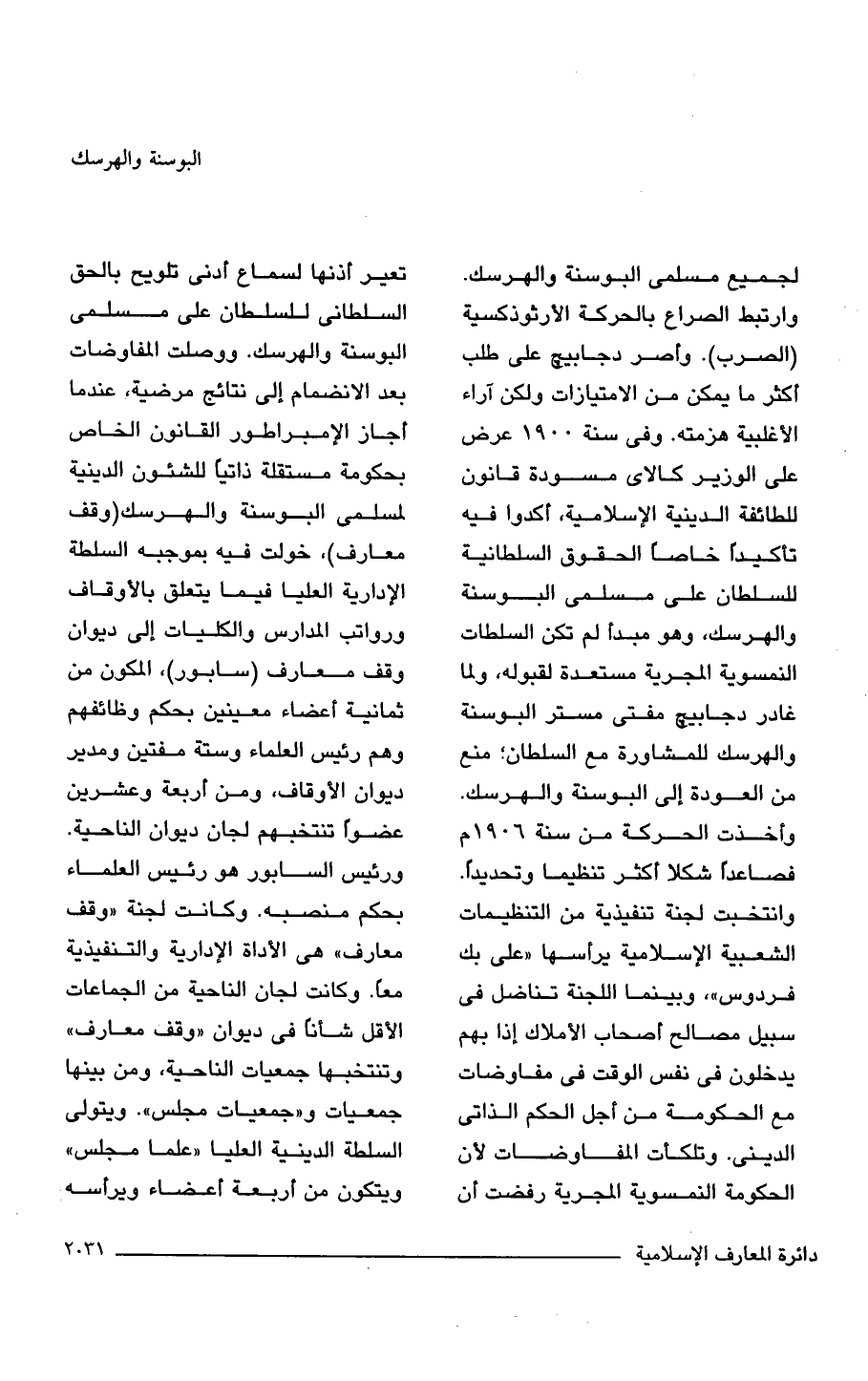 لجميع مسلمي البوسنة والهرسك. وارتبط الصراع بالحركة الأرثوذكسية (الصرب). وأصر دجابيج على طلب أكثر ما يمكن من الامتيازات ولكن آراء الأغلبية هزمته. وفي سنة 1900 عرض على الوزير كالاى مسودة قانون للطائفة الدينية الإسلامية، أكدوا فيه تأكيدًا خاصًّا الحقوق السلطانية للسلطان على مسلمي البوسنة والهرسك، وهو مبدأ لم تكن السلطات النمسوية المجرية مستعدة لقبوله، ولما غادر دجابيج مفتى مستر البوسنة والهرسك للمشاورة مع السلطان؛ منع من العودة إلى البوسنة والهرسك. وأخذت الحركة من سنة 1906 م فصاعدًا شكلا أكثر تنظيمًا وتحديدًا. وانتخبت لجنة تنفيذية من التنظيمات الشعبية الإسلامية يرأسها "على بك فردوس" وبينما اللجنة تناضل في سبيل مصالح أصحاب الأملاك إذا بهم يدخلون في نفس الوقت في مفاوضات مع الحكومة من أجل الحكم الذاتى الدينى. وتلكأت المفاوضات لأن الحكومة النمسوية المجرية رفضت أن تعير أذنها لسماع أدنى تلويح بالحق السلطانى للسلطان على مسلمي البوسنة والهرسك. ووصلت المفاوضات بعد الانضمام إلى نتائج مرضية، عندما أجاز الإمبراطور القانون الخاص بحكومة مستقلة ذاتيًا للشئون الدينية لمسلمى البوسنة والهرسك (وقف معارف)، خولت فيه بموجبه السلطة الإدارية العليا فيما يتعلق بالأوقاف ورواتب المدارس والكليات إلى ديوان وقف معارف (سابور)، المكون من ثمانية أعضاء معينين بحكم وظائفهم وهم رئيس العلماء وستة مفتين ومدير ديوان الأوقاف، ومن أربعة وعشرين عضوًا تنتخبهم لجان ديوان الناحية. ورئيس السابور هو رئيس العلماء بحكم منصبه. وكانت لجنة "وقف معارف" هي الأداة الإدارية والتنفيذية معًا. وكانت لجان الناحية من الجماعات الأقل شأنًا في ديوان "وقف معارف" وتنتخبها جمعيات الناحية، ومن بينها جمعيات و "جمعيات مجلس". ويتولى السلطة الدينية العليا "علما مجلس" ويتكون من أربعة أعضاء ويرأسه
