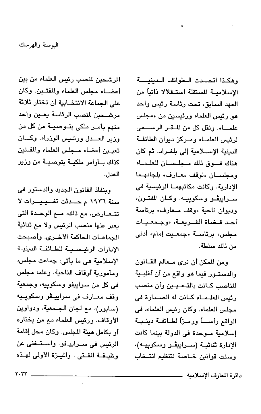 ومن الممكن أن نرى معالم القانون والدستور فيما هو واقع من أن أغلبية المناصب كانت بالتعيين وأن منصب رئيس العلماء كانت له الصدارة في مجلس العلماء. وكان رئيس العلماء، في الواقع رأسًا ورمزًا لطائفة دينية إسلامية موحدة في الدولة بينما كانت الإدارة ثنائية (سراييفو وسكوبيه)، وسنت قوانين خاصة لتنظيم انتخاب المرشحين لمنصب رئيس العلماء من بين أعضاء مجلس العلماء والمفتين. وكان على الجماعة الانتخابية أن تختار ثلاثة مرشحين لمنصب الرئاسة يعين واحد منهم بأمر ملكى بتوصية من كل من وزير العدل ورئيس الوزراء. وكان تعيين أعضاء مجلس العلماء والمفتين كذلك بأوامر ملكية بتوصية من وزير العدل.