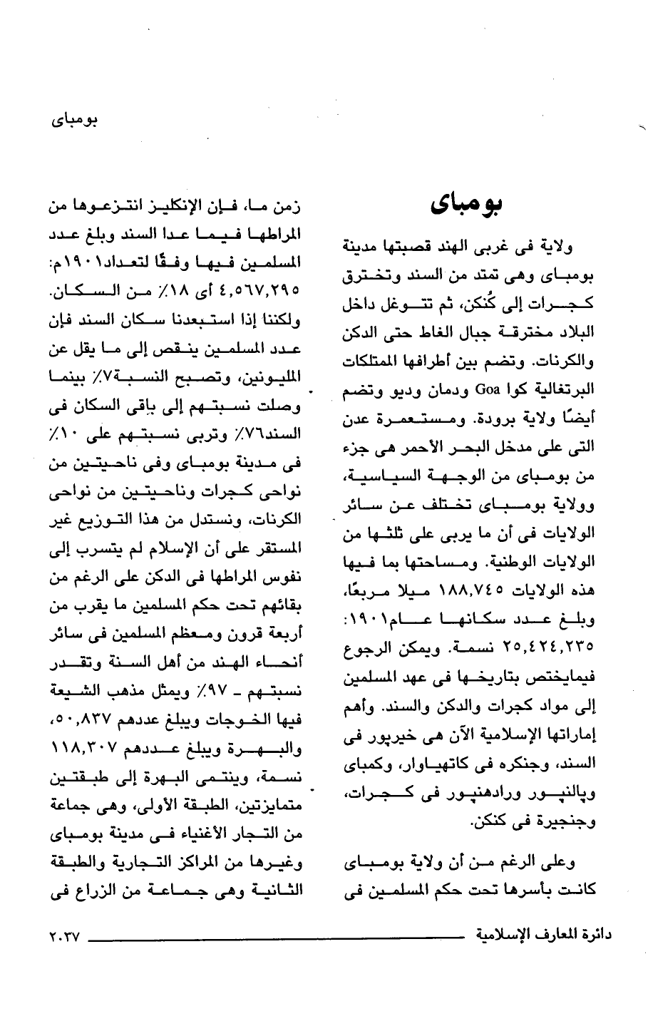 ولاية في غربي الهند قصبتها مدينة بومباى وهي تمتد من السند وتخترق كجرات إلى كُنكن، ثم تتوغل داخل البلاد مخترقة جبال الغاط حتى الدكن والكرنات. وتضم بين أطرافها الممتلكات البرتغالية كوا Goa ودمان وديو وتضم أيضًا ولاية برودة. ومستعمرة عدن التي على مدخل البحر الأحمر هي جزء من بومباى من الوجهة السياسية، وولاية بومباى تختلف عن سائر الولايات في أن ما يربى على ثلثها من الولايات الوطنية. ومساحتها بما فيها هذه الولايات 188.745 ميلا مربعًا، وبلغ عدد سكانها عام 1901: 25.424.235 نسمة. ويمكن الرجوع فيما يختص بتاريخها في عهد المسلمين إلى مواد كجرات والدكن والسند. وأهم إماراتها الإسلامية الآن هي خيربور في السند، وجنكره في كاتهياوار، وكمباى وبالنبور ورادهنبور في كجرات، وجنجيرة في كنكن.