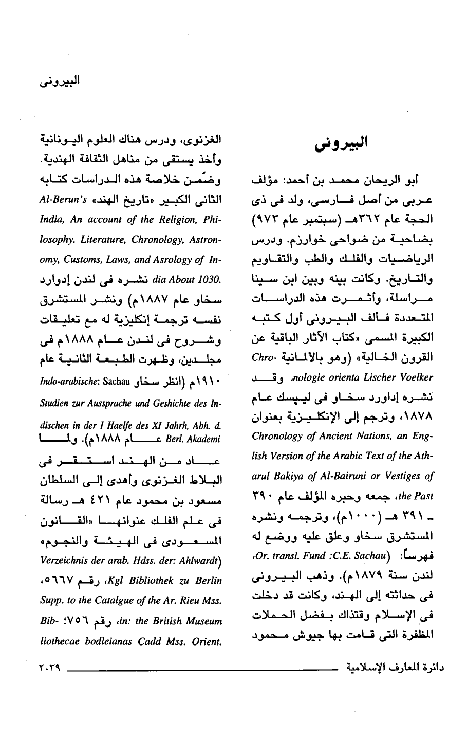 أبو الريحان محمد بن أحمد: مؤلف عربي من أصل فارسى، ولد في ذي الحجة عام 362 هـ (سبتمبر عام 973) بضاحية من ضواحي خوارزم. ودرس الرياضيات والفلك والطب والتقاويم والتاريخ. وكانت بينه وبين ابن سينا مراسلة، وأثمرت هذه الدراسات المتعددة فألف البيرونى أول كتبه الكبيرة المسمى "كتاب الآثار الباقية عن القرون الخالية" (وهو بالألمانية - Chro nologie orienta Lischer Voelker. وقد نشره إداورد سخاو في ليبسك عام 1878، وترجم إلى الإنكليزية بعنوان - Chronology of Ancient Nations, an Eng -lish Version of the Arabic Text of the Ath arul Bakiya of Al-Bairuni or Vestiges of the Past, جمعه وحبره المؤلف عام 390 - 391 هـ (1000 م)، وتر جمه ونشره المستشرق سخاو وعلق عليه ووضع له فهرسًا: (Or. transl. Fund: C. E. Sachau، لندن سنة 1879 م). وذهب البيرونى في حداثته إلى الهند، وكانت قد دخلت في الإسلام وقتذاك بفضل الحملات المظفرة التي قامت بها جيوش محمود الغزنوى، ودرس هناك العلوم اليونانية وأخذ يستقى من مناهل الثقافة الهندية. وضمّن خلاصة هذه الدراسات كتابه الثاني الكبير "تاريخ الهند" AL-Berun's - India, An account of the Religion, Phi -losophy. Literature, Chronology, Astron -omy, Customs, Laws, and Asrology of In dia About 1030 نشره في لندن إدوارد سخاو عام 1887 م) ونشر المستشرق نفسه ترجمة إنكليزية له مع تعليقات وشروح في لندن عام 1888 م في مجلدين، وظهرت الطبعة الثانية عام 1910 م (انظر سخاو Indo-arabische: Sachau - Studien zur Aussprache and Geshichte des In dischen in der I Haelfe des XL Jahrh, abh.d. Berl. Akademi عام 1888 م). ولما عاد من الهند استقر في البلاط الغزنوى وأهدى إلى السلطان مسعود بن محمود عام 421 هـ رسالة في علم الفلك عنوانها "القانون المسعودى في الهيئة والنجوم" (Verzeichnis der arab. Hdss. der: Ahlwardt Kgl Bibliothek zu Berlin رقم 5667، . Supp. to the Catalgue of the Ar. Rieu Mss in: the British Museum، رقم 756؛ Bib- .liothecae bodleianas Cadd Mss. Orient