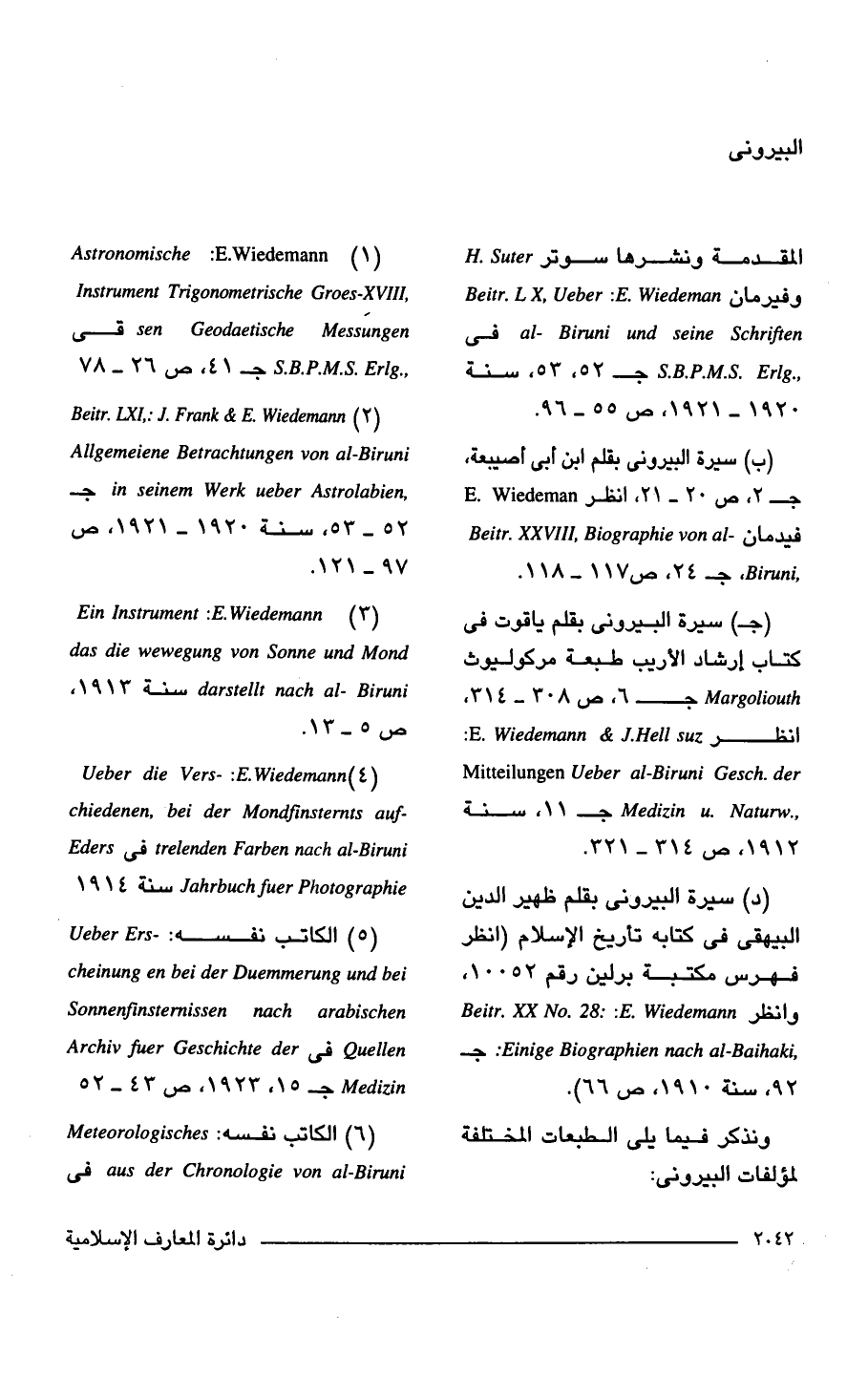 (2) J. Frank & E. Wiedemann: Beitr. LXI, Allgemeiene Betrachtungen von al-Biruni in seinem Werk ueber Astrolabienm, جـ 52 - 53، سنة 1920 - 1921، ص 97 - 121.