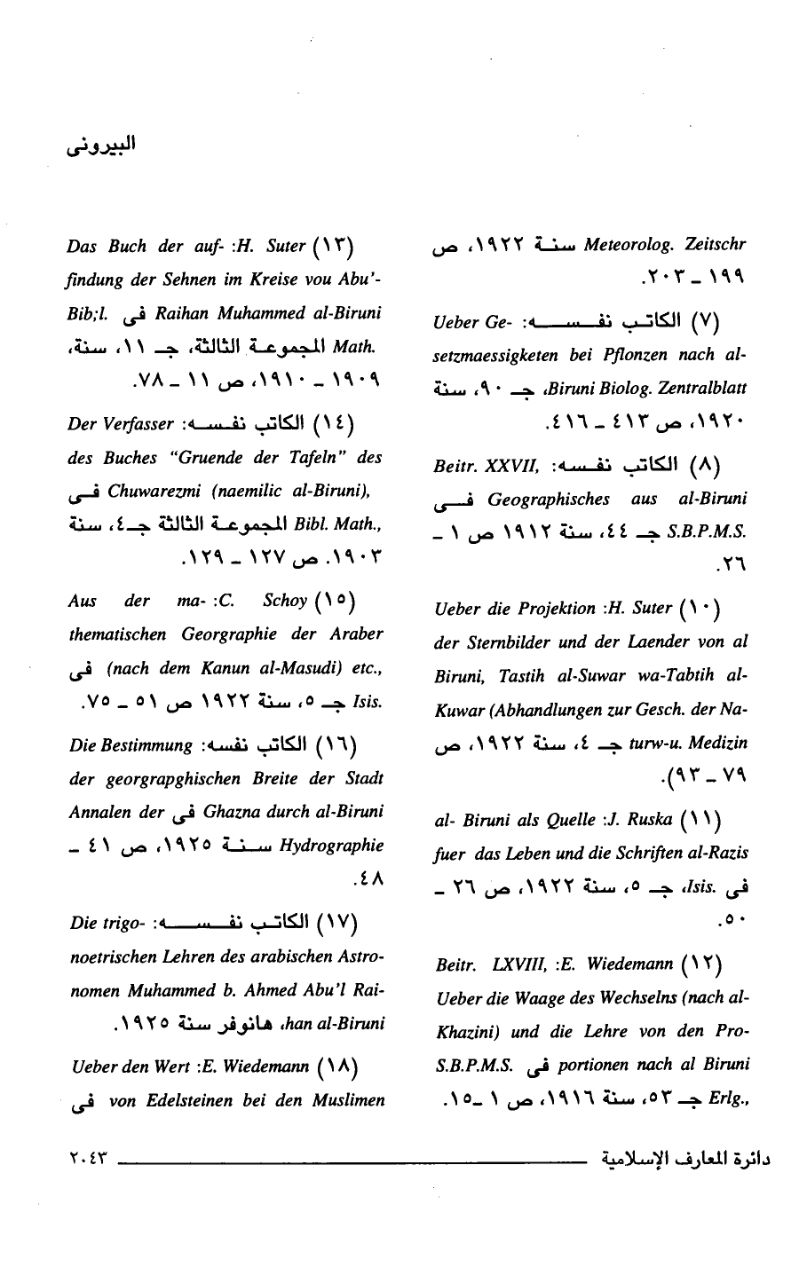 (10) H. Suter: Ueber die Projektion der .Sternhilder and der Laender von al -Biruni. Tastih al-Suwar wa-Tabtih al -Kuwar (Abhandlungen zur Gesch. der Na turw-u. Medizin جـ 4، سنة 1922، ص 79 - 93).