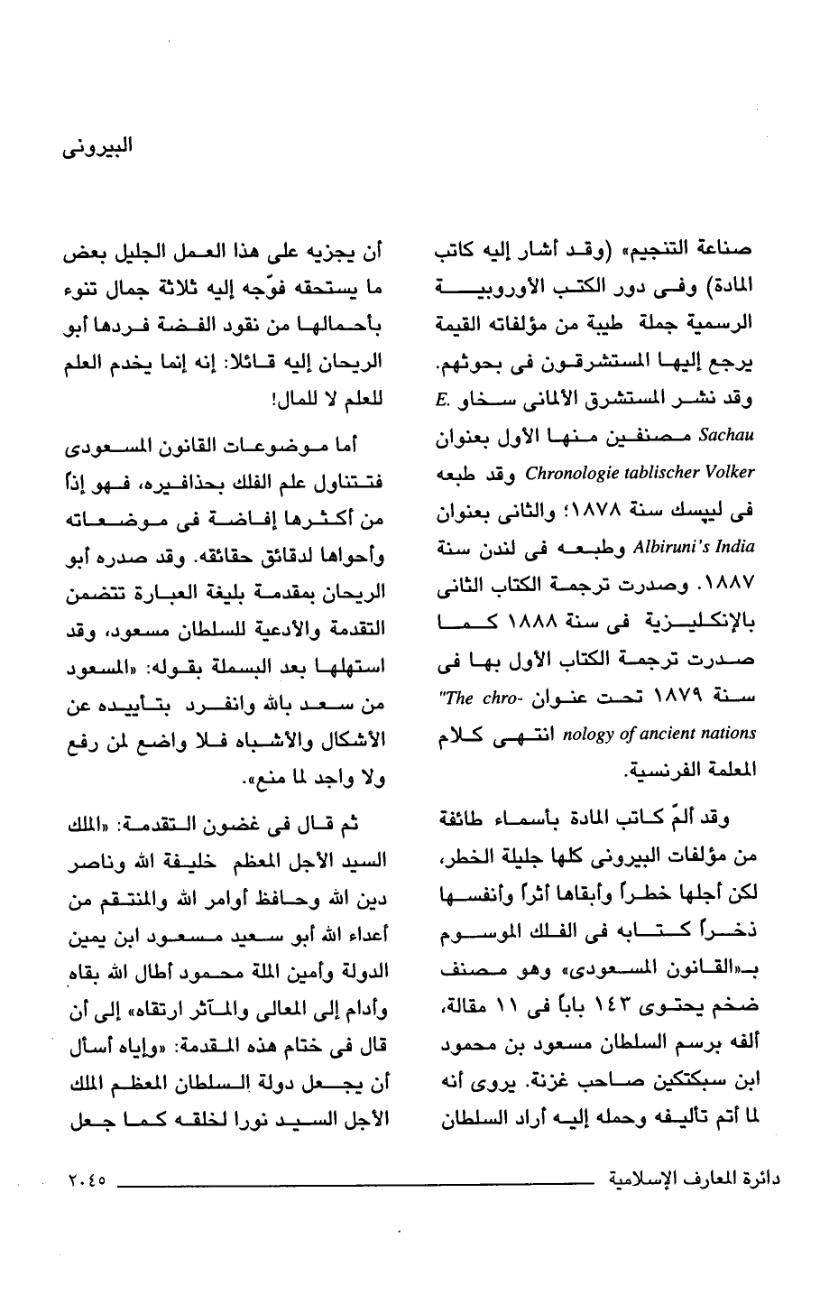 صناعة التنجيم" (وقد أشار إليه كاتب المادة) وفي دور الكتب الأوروبية الرسمية جملة طيبة من مؤلفاته القيمة يرجع إليها المستشرقون في بحوثهم. وقد نشر المستشرق الألمانى سخاو. E Sachau مصنفين منها الأول بعنوان Chronologie tablischer Volker وقد طبعه في ليبسك سنة 1878؛ والثاني بعنوان Albiruni's India وطبعه في لندن سنة 1887. وصدرت ترجمة الكتاب الثاني بالإنكليزية في سنة 1888 كما صدرت ترجمة الكتاب الأول بها في سنة 1879 تحت عنوان " The chro- nology of ancient nations انتهى كلام المعلمة الفرنسية.