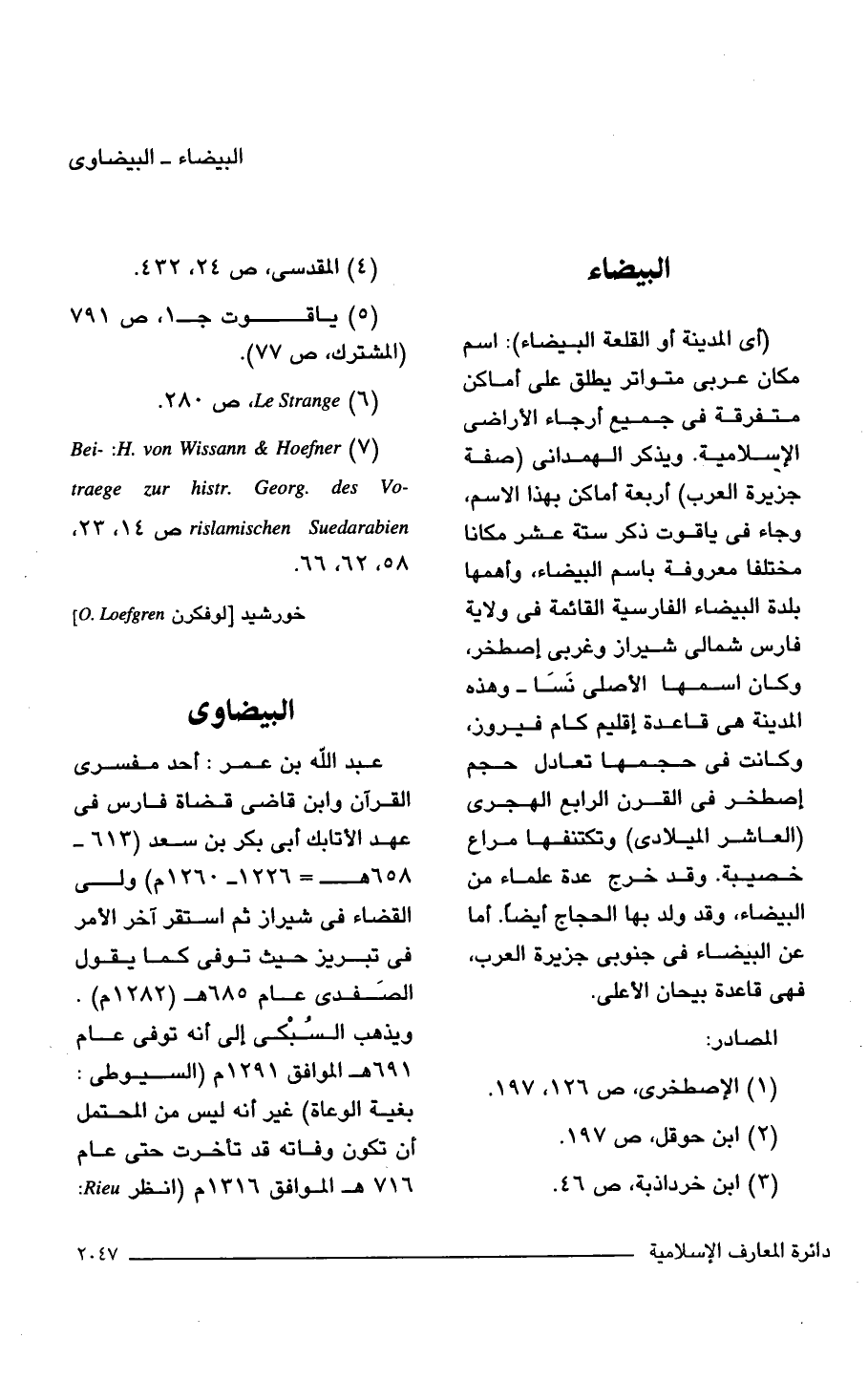 (أي المدينة أو القلعة البيضاء): اسم مكان عربي متواتر يطلق على أماكن متفرقة في جميع أرجاء الأراضي الإسلامية. ويذكر الهمدانى (صفة جزيرة العرب) أربعة أماكن بهذا الاسم، وجاء في ياقوت ذكر ستة عشر مكانا مختلفا معروفة باسم البيضاء، وأهمها بلدة البيضاء الفارسية القائمة في ولاية فارس شمالي شيراز وغربى إصطخر، وكان اسمها الأصلي نَسَا - وهذه المدينة هي قاعدة إقليم كام فيروز، وكانت في حجمهما تعادل حجم إصطخر في القرن الرابع الهجرى (العاشر الميلادي) وتكتنفها مراع خصيبة. وقدخرج عدة علماء من البيضاء، وقد ولد بها الحجاج أيضًا. أما عن البيضاء في جنوبي جزيرة العرب، فهي قاعدة بيحان الأعلى.