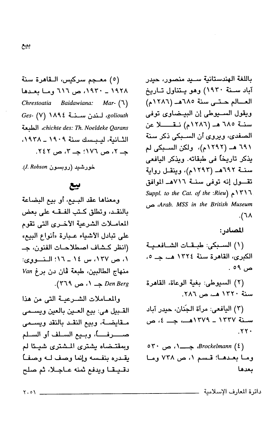 ومعناها عقد البيع، أو بيع البضاعة بالنقد، وتطلق كتب الفقه على بعض المعاملات الشرعية الأخرى التي تقوم على تبادل الأشياء عبارة "أنواع البيع" (انظر كشاف اصطلاحات الفنون، جـ 1، ص 137، س 14 - 16؛ النووي: منهاج الطالبين، طبعة فإن دن برغ Van Den Berg جـ 1، ص 369).