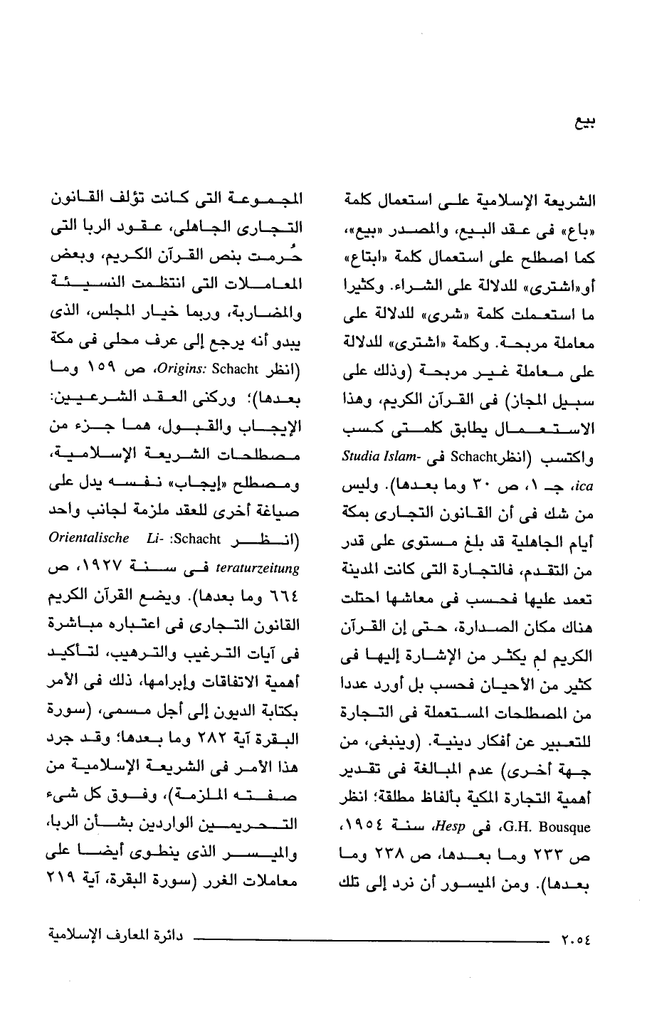 الشريعة الإسلامية على استعمال كلمة "باع" في عقد البيع، والمصدر "بيع"، كما اصطلح على استعمال كلمة "ابتاع" أو"اشترى" للدلالة على الشراء. وكثيرا ما استعملت كلمة "شرى" للدلالة على معاملة مربحة. وكلمة "اشترى" للدلالة على معاملة غير مربحة (وذلك على سبيل المجاز) في القرآن الكريم، وهذا الاستعمال يطابق كلمتى كمسب واكتسب (انظر Schacht في Studia Islam- ice، جـ 1، ص 30 وما بعدها). وليس من شدُ في أن القانون التجارى بمكة أيام الجاهلية قد بلغ مستوى على قدر من التقدم، فالتجارة التي كانت المدينة تعمد عليها فحسب في معاشها احتلت هنالىً مكان الصدارة، حتى إن القرآن الكريم لم يكثر من الإشارة إليها في كثير من الأحيان فحسب بل أورد من المصطلحات المستعملة في التجارة للتعبير عن أفكار دينية. (وينبغى، من جهة أخرى) عدم المبالغة في تقدير أهمية التجارة المكية بألفاظ مطلقة؛ انظر G.H. Bousque، في Hesp، سنة 1954، ص 233 وما بعدها، ص 238 وما بعدها). ومن الميسور أن نرد إلى تلك المجموعة التي كانت تؤلف القانون التجارى الجاهلى، عقود الربا التي حُرمت بنص القرآن الكريم، وبعض المعاملات التي انتظمت النسيئة والمضاربة، وربما خيار المجلس، الذي يبدو أنه يرجع إلى عرف محلى في مكة (انظر Origins: Schacht، ص 159 وما بعدها)؛ وركنى العقد الشرعيين: الإيجاب والقبول، هما جزء من مصطلحات الشريعة الإسلامية، ومصطلح "إيجاب" نفسه يدل على صياغة أخرى للعقد ملزمة لجانب واحد (انظر Orientalische Li-: Schacht teraturzeitung في سنة 1927، ص 664 وما بعدها). ويضع القرآن الكريم القانون التجارى في اعتباره مباشرة في آيات الترغيب والترهيب، لتأكيد أهمية الاتفاقات وإبرامها، ذلك في الأمر بكتابة الديون إلى أجل مسمى، (سورة البقرة آية 282 وما بعدها؛ وقد جرد هذا الأمر في الشريعة الإسلامية من صفته الملزمة)، وفوق كل شيء التحريمين الواردين بشأن الربا، والميسر الذي ينطوى أيضًا على معاملات الغرر (سورة البقرة، آية 219